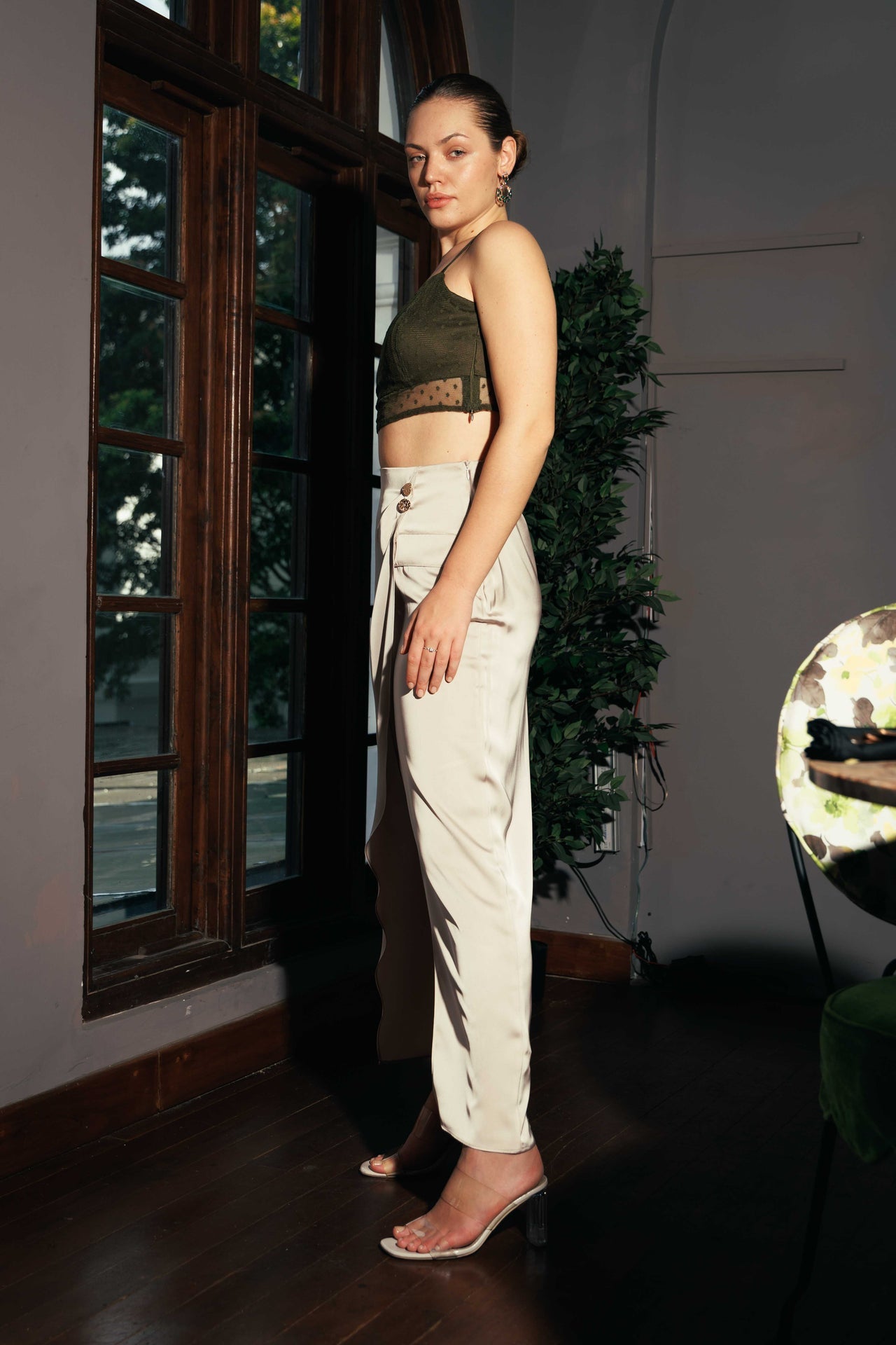 Crafted from a delicate olive green mesh with subtle dot detailing, this top adds a touch of whimsical texture to any ensemble. The bralette-style cut features a flattering curve neckline and thin straps, while the sheer fabric offers a sophisticated, modern finish. This unique top is designed for cocktail parties, stylish evening outings, or a date night. Pair it with high-waisted bottoms, such as a flowing satin skirt or tailored pants, to create a balanced silhouette. Complement the look with statement earrings and a pair of chic heeled sandals for a confident and unforgettable impression.