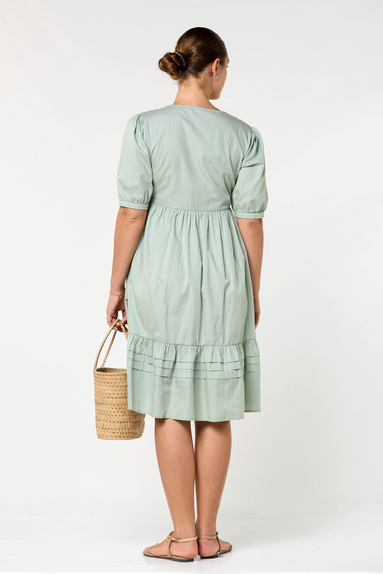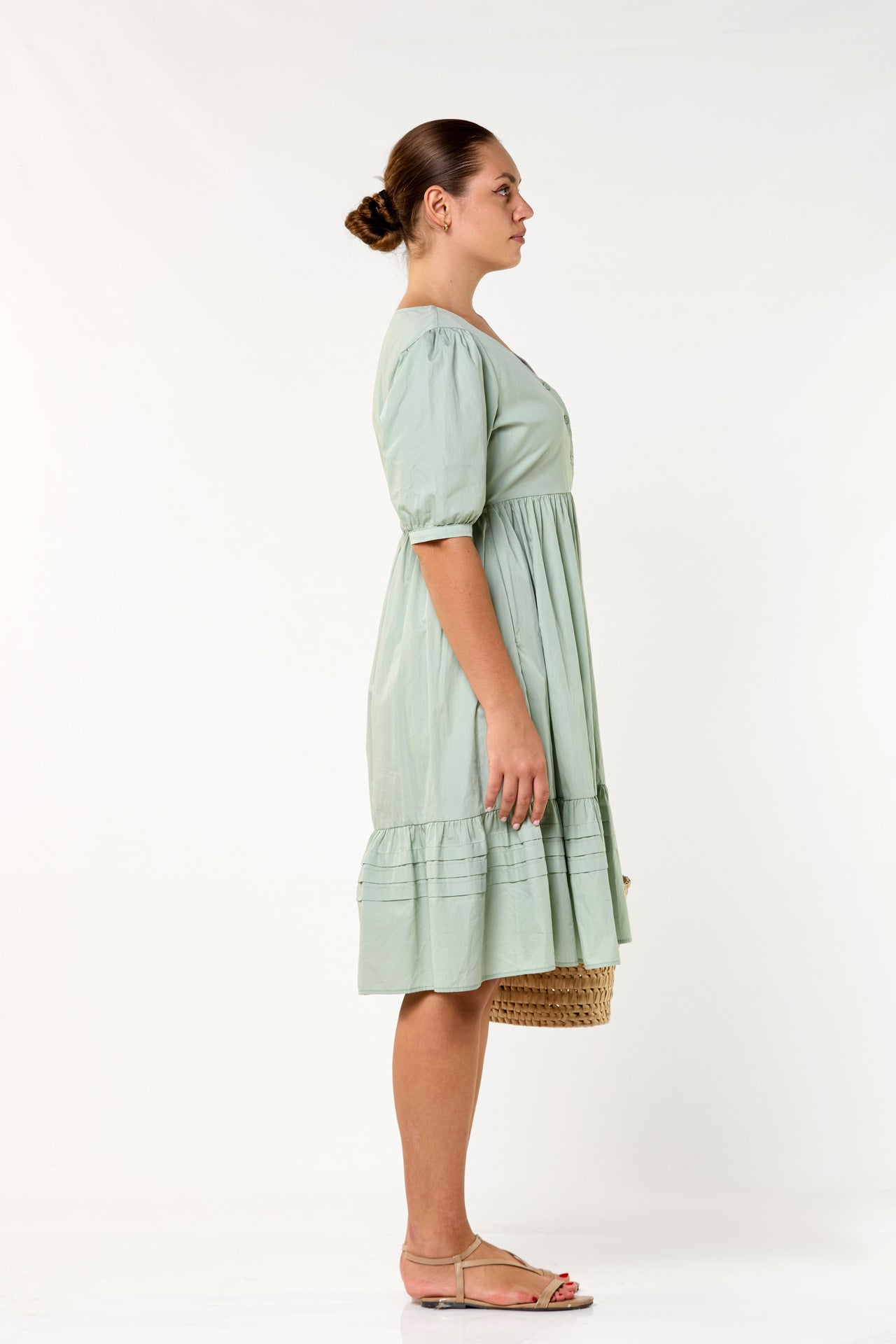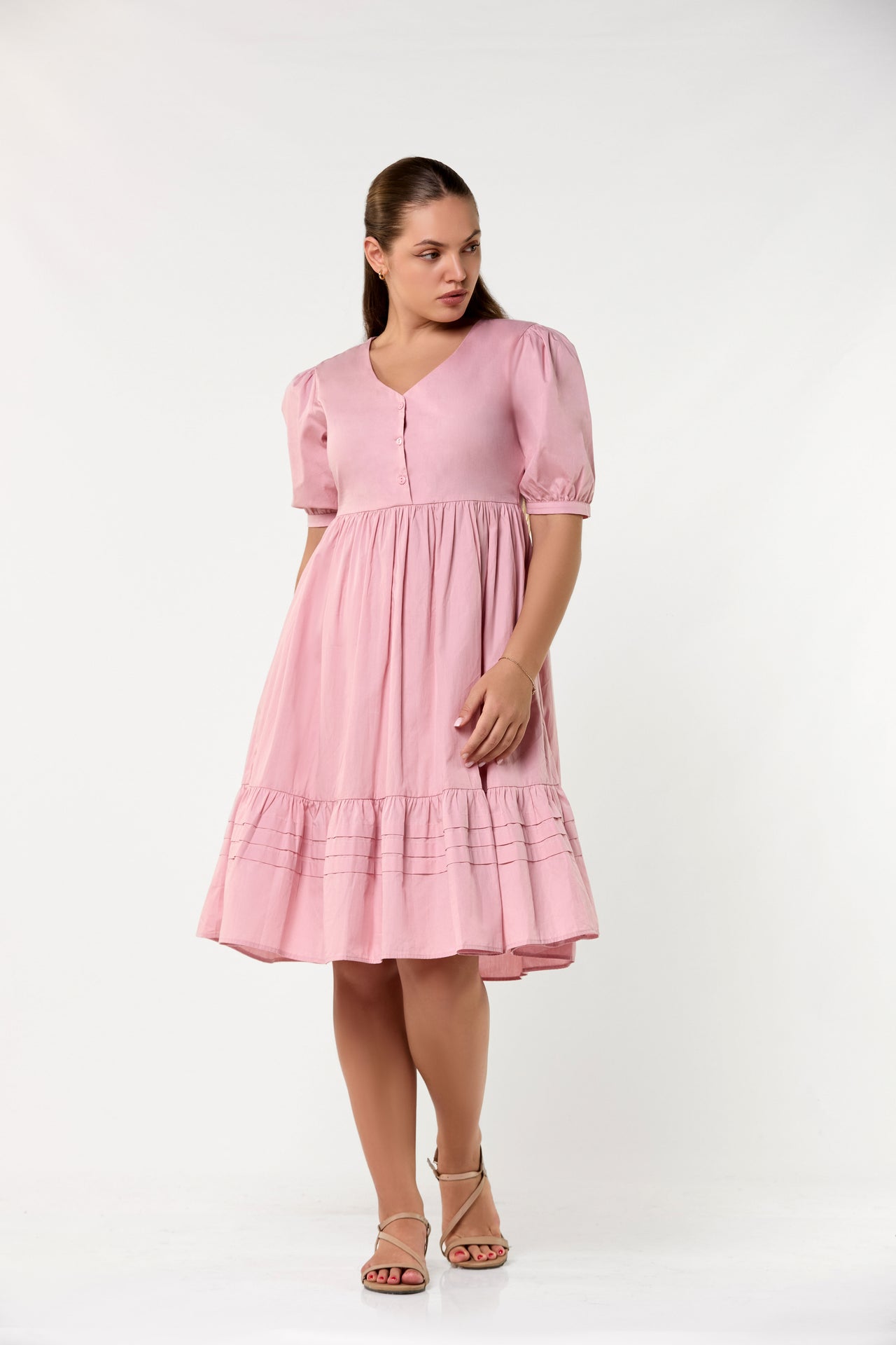 This romantic piece features a soft V-neckline and delicate puff sleeves, exuding feminine charm. The high-waisted, gathered bodice flows into a tiered skirt accented with fine horizontal pintuck details. Its knee length silhouette and button-front design offer a graceful, timeless aesthetic for any daytime occasion.