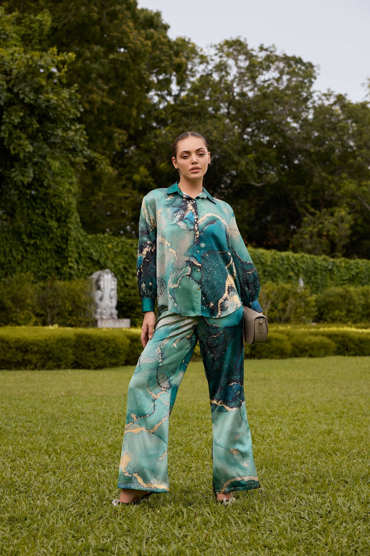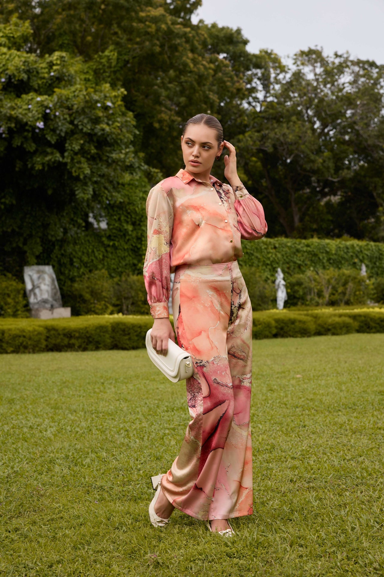 Unveil understated elegance with this halter-neck eveningwear dress, where contemporary charm meets artistic allure. This long-length silhouette features a keyhole neckline and a high front slit, perfectly balancing sophistication and allure. Crafted in a flowy, soft fabric, the dress showcases abstract batik print strokes in muted mauves and hints of rust, creating a visually poetic effect. The gathered waist offers gentle definition, flattering your form while allowing effortless movement. Elevate this look with nude or metallic heels to elongate the legs and complement the high slit. Add minimal gold or pearl accessories to keep the focus on the dress’s unique print and neckline. For a polished evening ensemble, pair with a sleek bun or soft waves and a subtle clutch in a neutral or matching tone. This style perfectly matching for garden soirées or cocktail evenings.