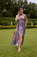 Unveil understated elegance with this halter-neck eveningwear dress, where contemporary charm meets artistic allure. This long-length silhouette features a keyhole neckline and a high front slit, perfectly balancing sophistication and allure. Crafted in a flowy, soft fabric, the dress showcases abstract batik print strokes in muted mauves and hints of rust, creating a visually poetic effect. The gathered waist offers gentle definition, flattering your form while allowing effortless movement. Elevate this look with nude or metallic heels to elongate the legs and complement the high slit. Add minimal gold or pearl accessories to keep the focus on the dress’s unique print and neckline. For a polished evening ensemble, pair with a sleek bun or soft waves and a subtle clutch in a neutral or matching tone. This style perfectly matching for garden soirées or cocktail evenings.