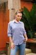 The front maintains a classic, polished look with a traditional point collar and a full button placket secured by subtle, coordinating pink buttons. The long sleeves are finished with standard buttoned cuffs, which can be easily rolled up for a more casual, undone aesthetic. The overall silhouette is intentionally relaxed and slightly oversized, creating that perfect "borrowed from the boys" feel while maintaining a distinctly feminine appeal. The curved hemline allows it to be worn stylishly untucked, tucked, or even tied at the waist.