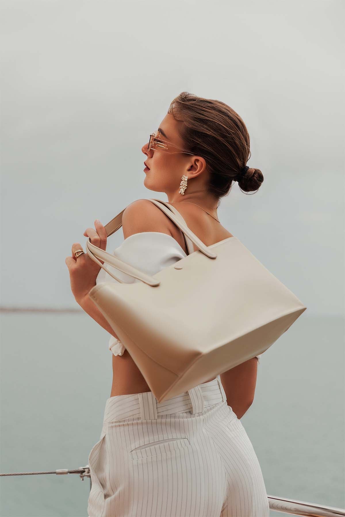 Refined lines meet everyday versatility. Crafted in smooth cowhide, The Berth Quarter Tote includes an extra pouch and comes in bold black or soft cream — a design that holds its shape and its sophistication, wherever you dock.