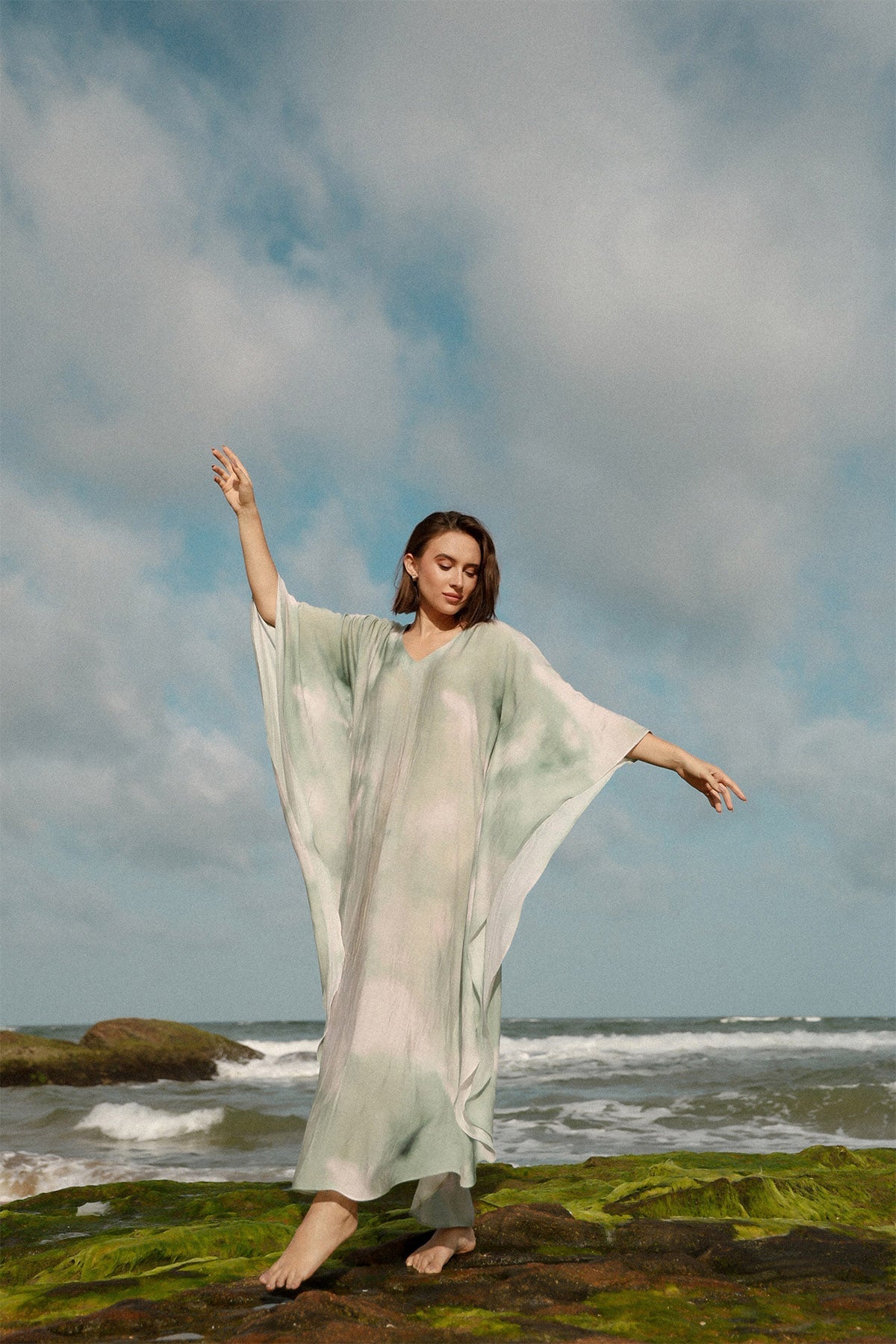 The dress's main highlight is its unique, abstract print, which features a vibrant blend of warm pink and creamy white. The pattern has a soft, tie-dye or watercolor-like quality, making each piece feel one-of-a-kind. The V-neckline and wide, draped sleeves add to the dress's bohemian charm. The lightweight fabric ensures it moves with grace, whether you're walking along the beach or lounging by the pool.