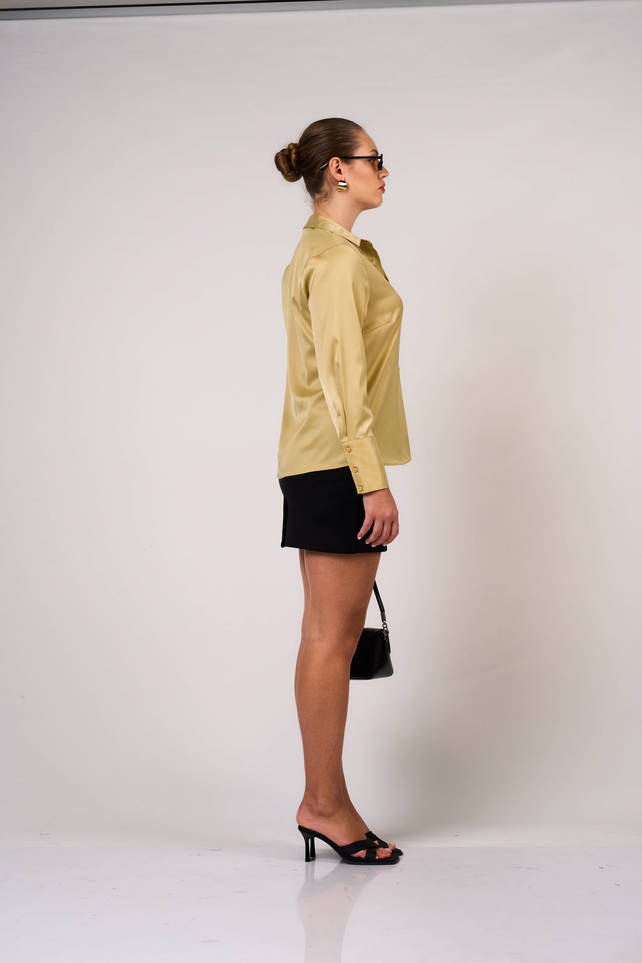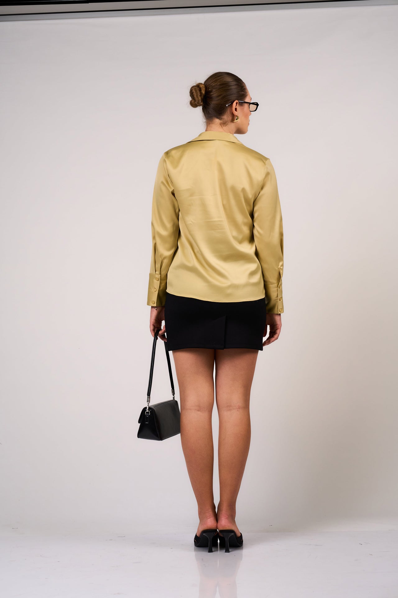 Inject a vibrant sophisticated touch into your workwear with this satin-finish long-sleeved blouse in a striking chartreuse hue. This top features a traditional pointed collar and a streamlined button-front, elevated by a luminous fabric that drapes elegantly for a liquid-like effect. The tailored cuffs provide a crisp, structural contrast to the fluid body of the shirt, ensuring you look polished from every angle. Perfectly suited for those who want to stand out while maintaining a professional silhouette, this blouse is a masterclass in modern office glamour.