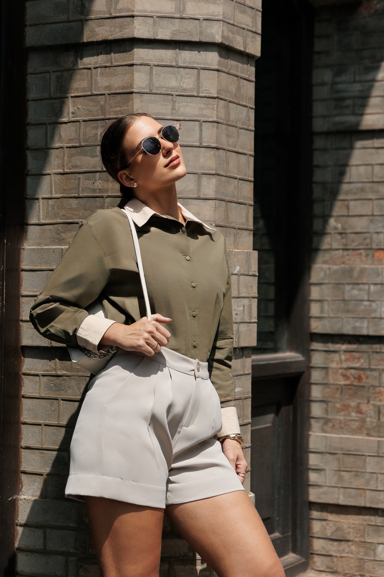 The model is wearing high-waisted, pleated shorts in a creamy off-white and beige colors. The shorts have a tailored, structured feel with a clean finish and a subtle front pleat, giving them a sophisticated look. She has paired them with a cropped, black ribbed knit top and is accessorizing with a small, off-white structured handbag and round sunglasses.