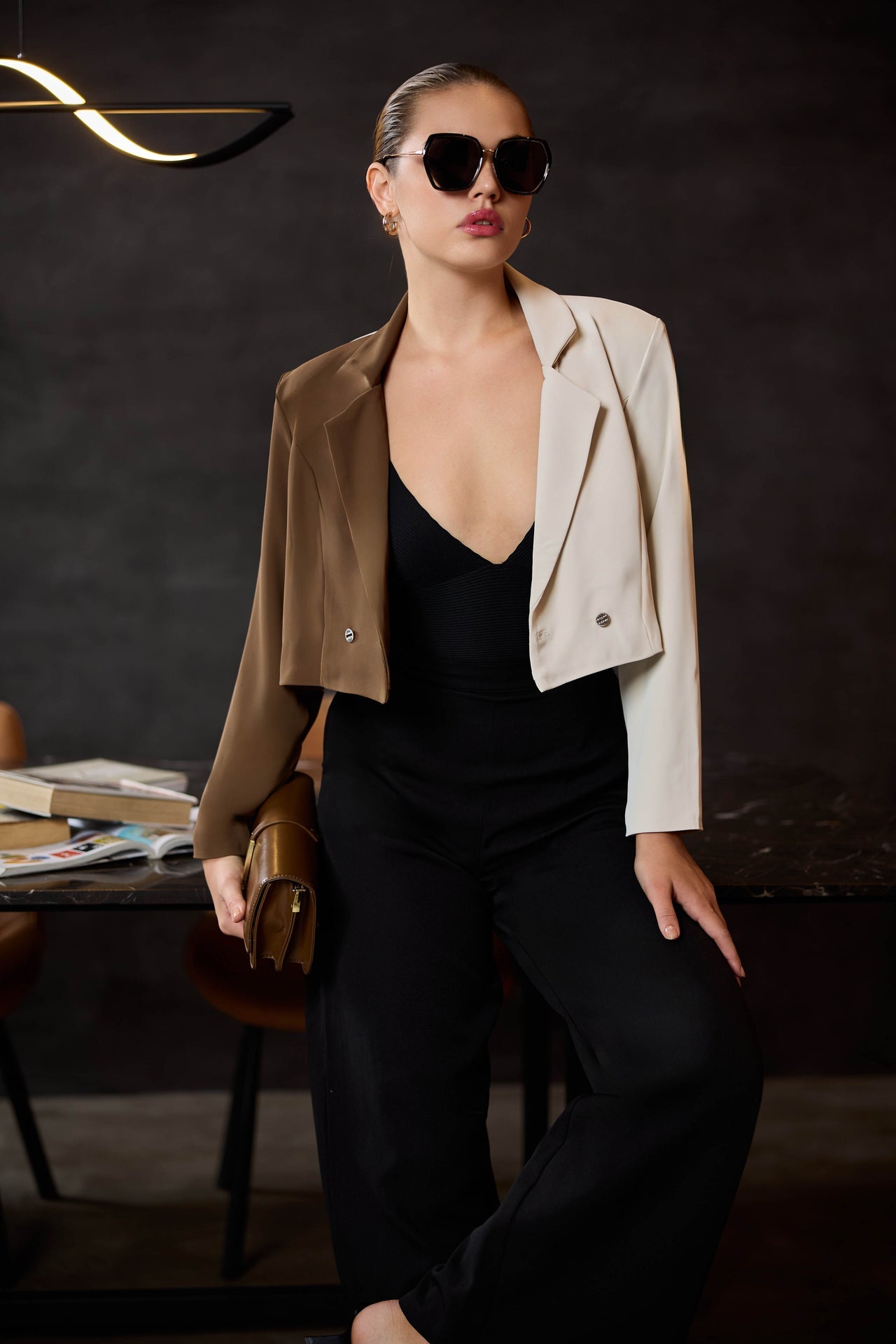 This color-block crop blazer is a modern twist on classic elegance. Designed with contrasting panels in sophisticated hues, the blazer features a semi-fitted cut that enhances the figure while maintaining a tailored look. The highlight of the piece is its two-way silver decorative buttons, adding a touch of refinement and versatility. Perfect for formal occasions, it offers a stylish yet professional appearance, balancing structure with comfort. The cropped length brings a contemporary edge, making it a chic choice for office wear seamlessly blending classic and modern design elements.
