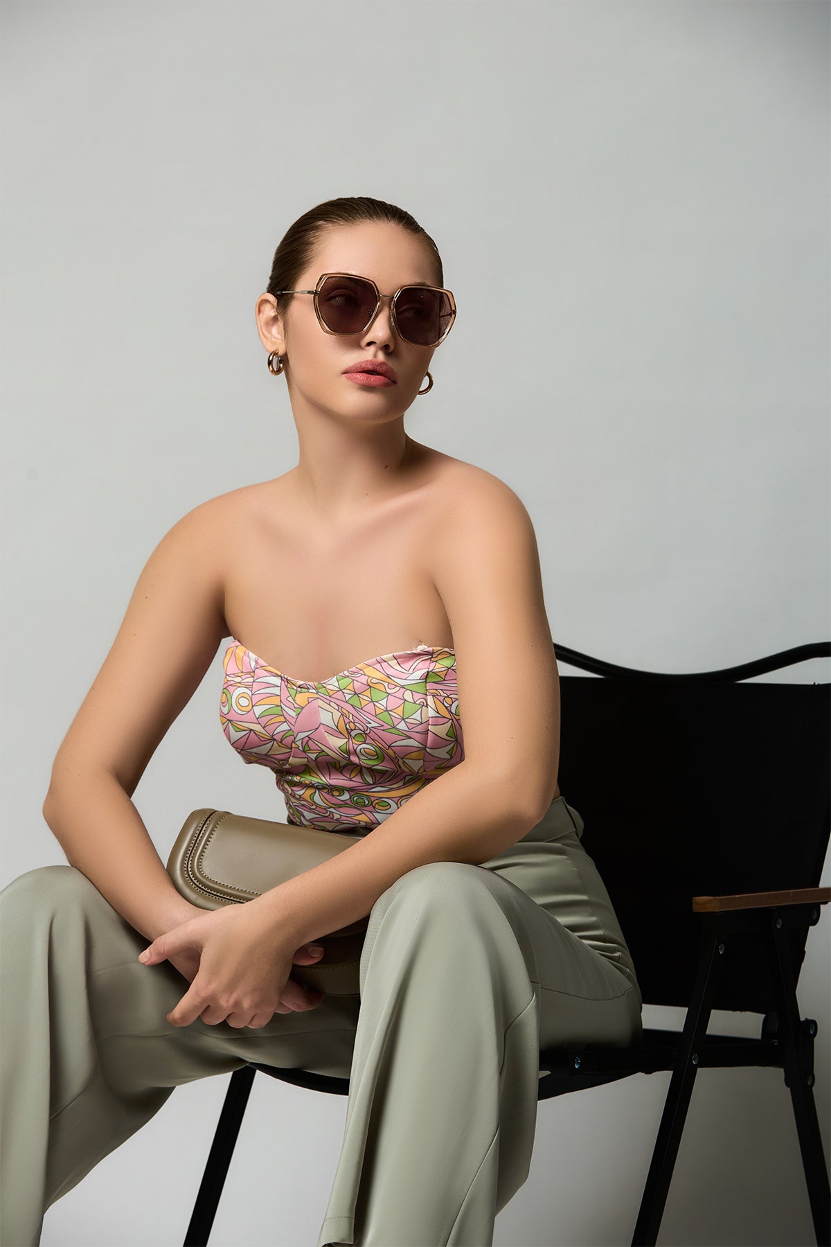 This is a stylish, fitted strapless bustier tube top featuring a vibrant, abstract, retro-inspired print in a ponte fabric.
