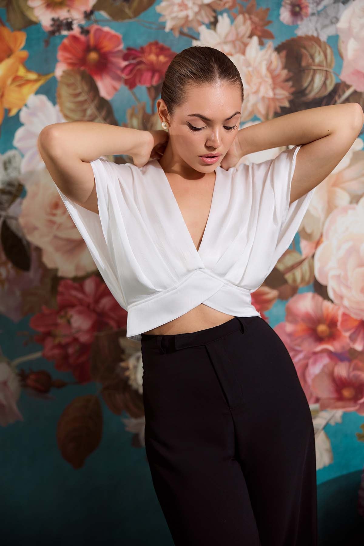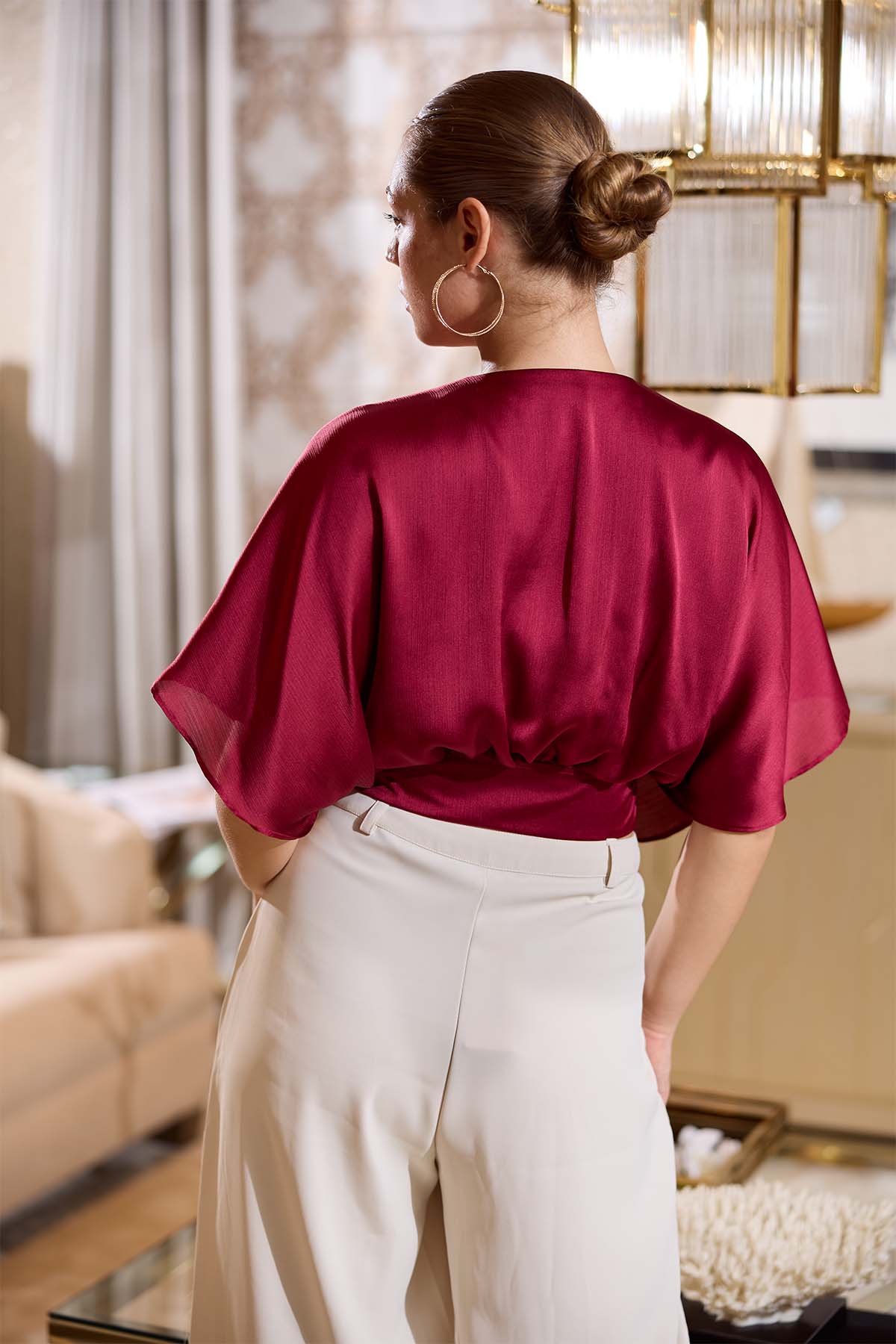 Embrace graceful elegance with this stunning top crafted from flowy fabric that moves beautifully with every step. Featuring a unique sleeve design that flows effortlessly from the shoulders and tapers to a flattering fit at the waist, this piece creates a striking, feminine silhouette. Perfect for special occasions or adding a touch of drama to your evening look, this top pairs beautifully with both sleek skirts and tailored trousers.