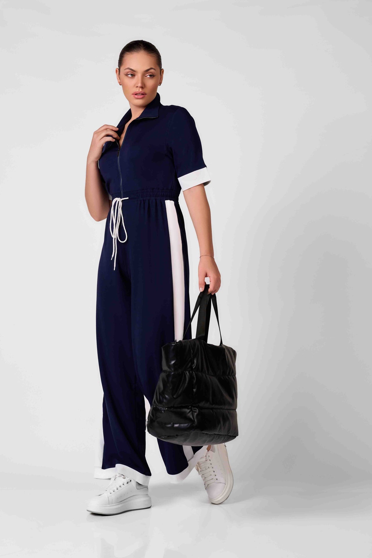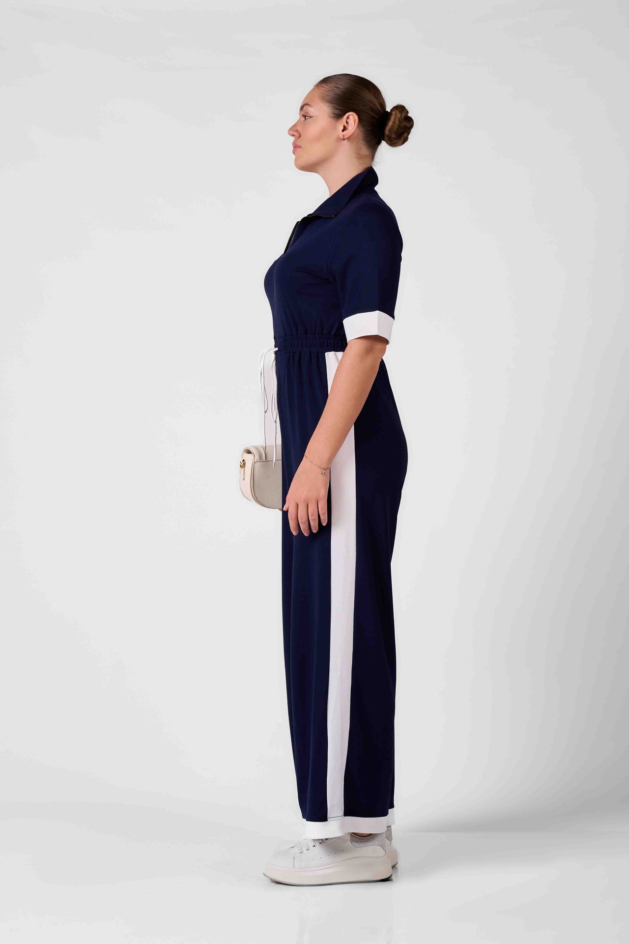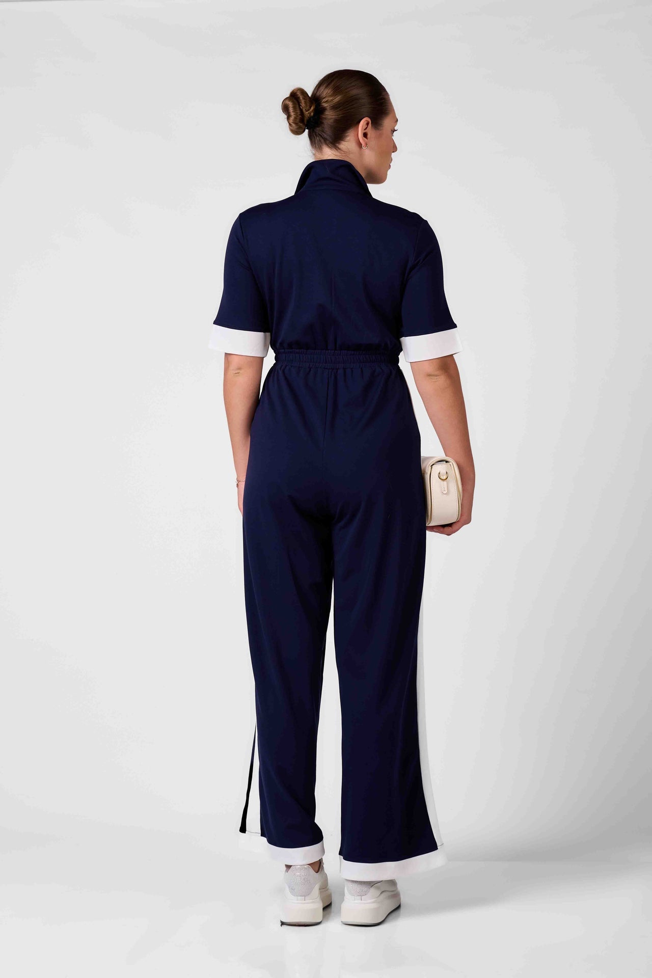 This athletic-inspired jumpsuit offers a modern, high-energy take on loungewear, combining structured details with a relaxed silhouette. It features a front-zip closure that extends into a high collar, allowing for adjustable styling. The short sleeves are finished with a bold contrast cuff, mirroring the wide vertical racing stripes that run down the length of the legs to create a lengthened, streamlined look. An elasticized drawstring waist provides custom definition, while the wide-leg trousers fall to a clean, contrasting hemline for a polished finish.