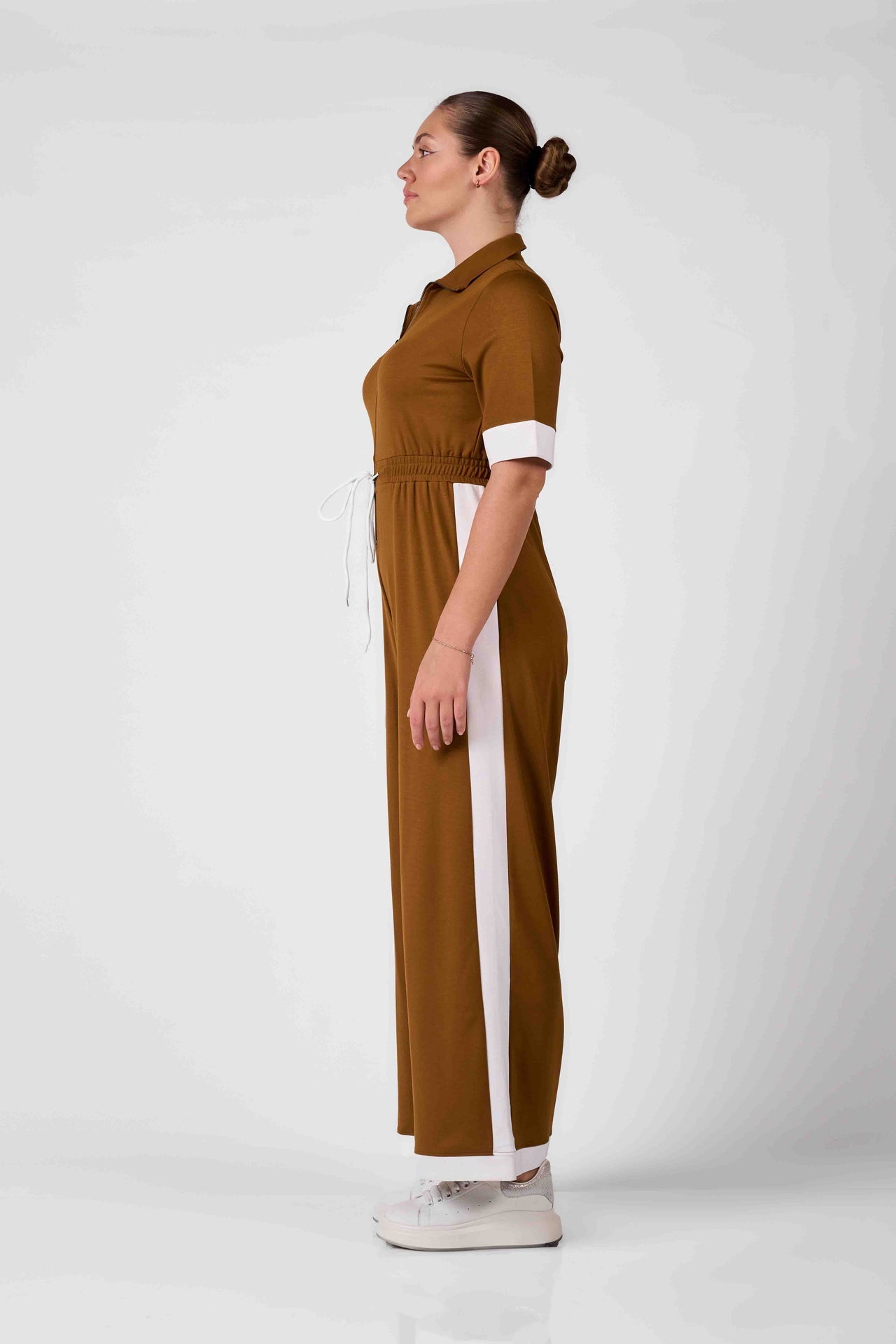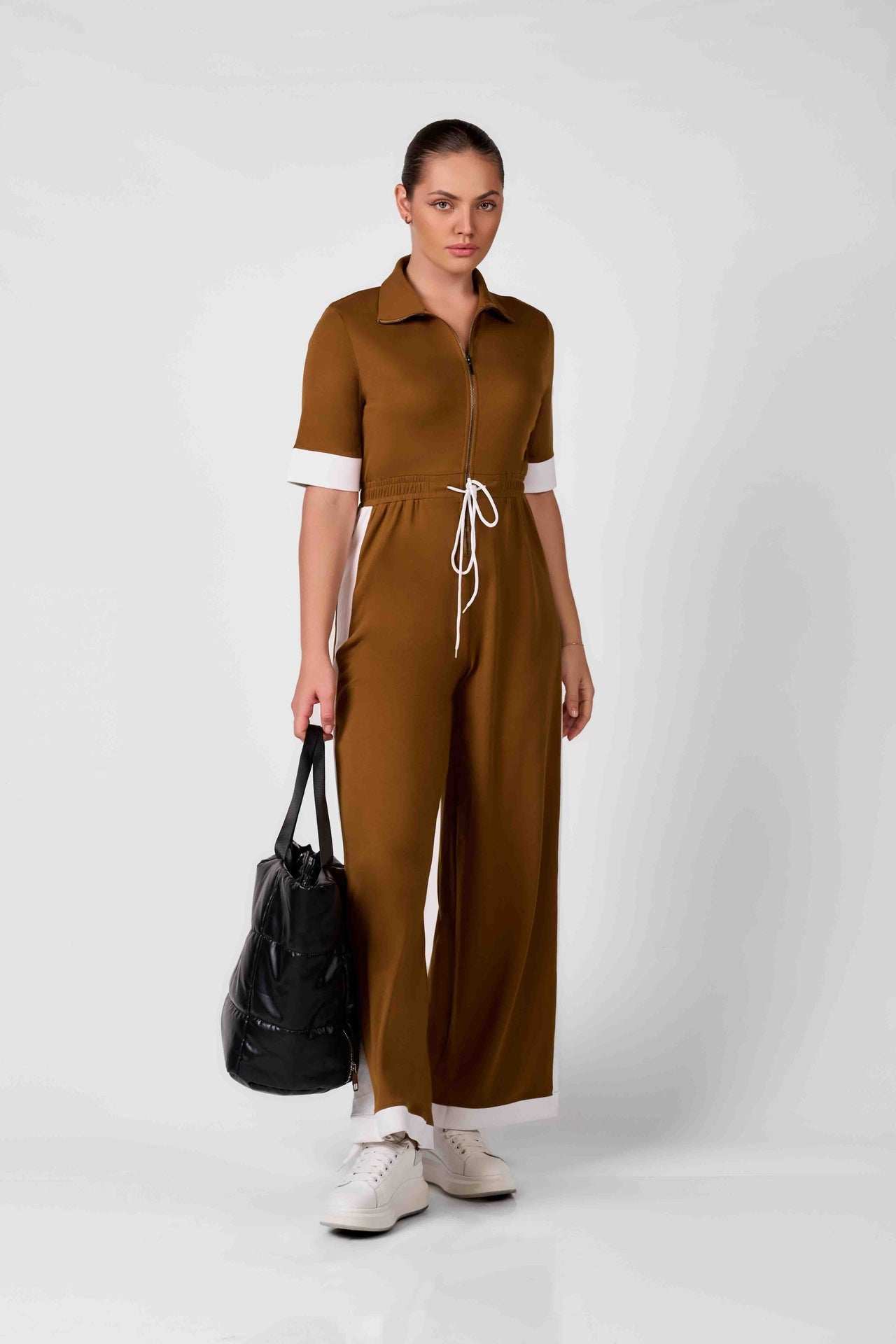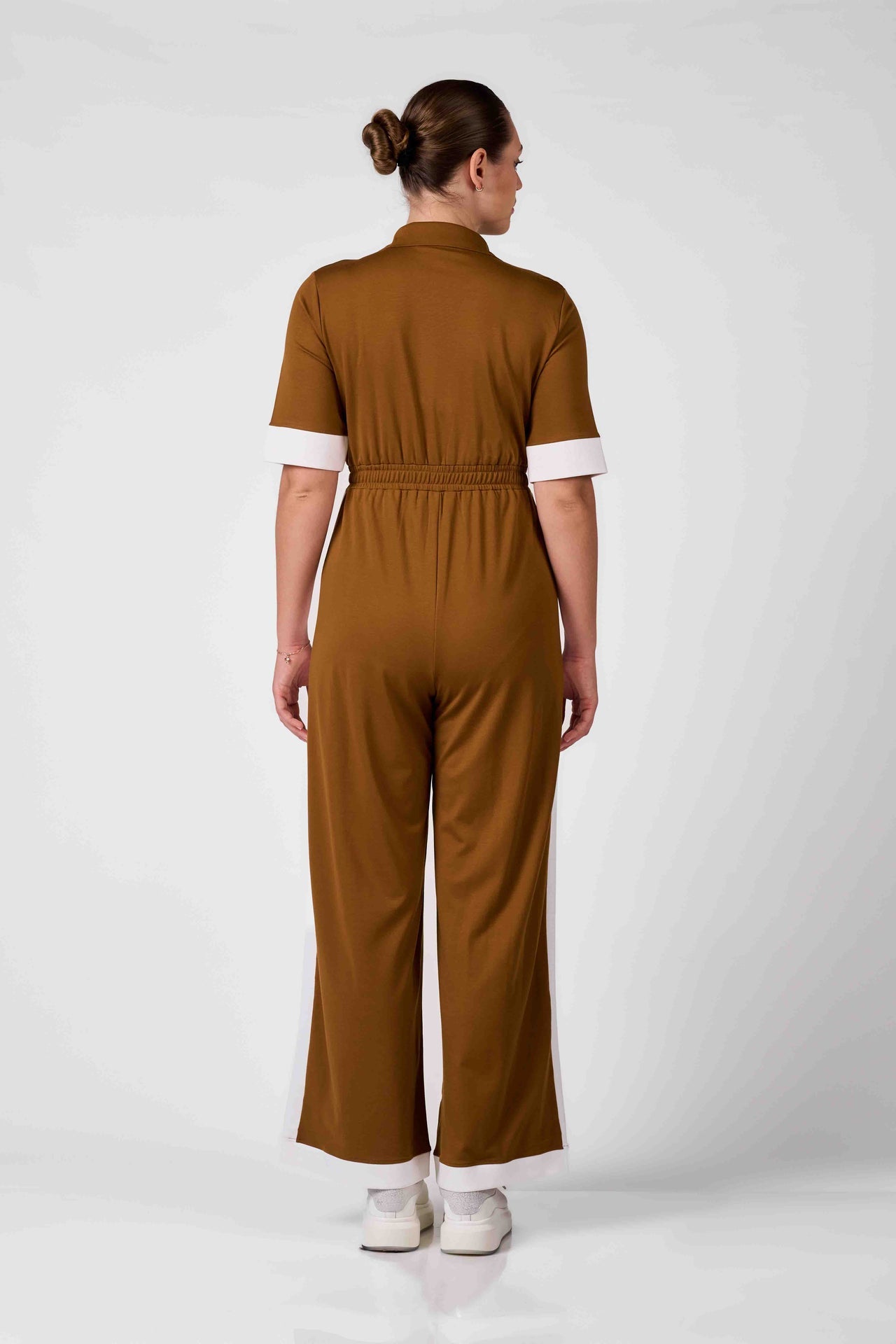 This athletic-inspired jumpsuit offers a modern, high-energy take on loungewear, combining structured details with a relaxed silhouette. It features a front-zip closure that extends into a high collar, allowing for adjustable styling. The short sleeves are finished with a bold contrast cuff, mirroring the wide vertical racing stripes that run down the length of the legs to create a lengthened, streamlined look. An elasticized drawstring waist provides custom definition, while the wide-leg trousers fall to a clean, contrasting hemline for a polished finish.