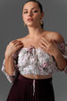 Make a romantic and stylish statement with the Ember Off-Shoulder Knot Top, a beautifully textured evening piece designed for dramatic flair, as seen here in a soft and calm color hues.This captivating top features a wide, elegant off-the-shoulder neckline that is beautifully framed by voluminous puff sleeves, which cinch in with a comfortable, feminine smocked cuff detail. The front of the bodice is enhanced by a chic knotting detail, creating flattering texture and a defined waistline in the cropped silhouette. Ideal for a summer cocktail party, an upscale dinner on the patio, or a stylish night out, this top pairs perfectly with high-waisted bottoms to balance its volume and cropped length. Style it with sleek white or cream tailored trousers for a striking contrast, and complete the ensemble with gold jewelry—such as delicate hoop earrings and bangles—along with heeled sandals for a polished and unforgettable look that emphasizes its captivating texture.