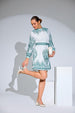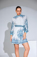 Step into refined elegance with this printed mini dress, crafted in a crisp white base adorned with intricate sky blue and light pink ornamental motifs. The high mandarin collar, long cuffed sleeves, and delicate gold front buttons evoke timeless sophistication, while the detachable printed belt cinches the waist to enhance the silhouette. Its A-line skirt flows effortlessly, making it a striking choice for day-to-night dressing. The detailed borders and symmetrical print placement lend an artisanal, almost regal finish to the design. As styling Options, go for statement hoops or pearl studs to enhance the neckline and pair with nude or white block heels for elegance. This eveningwear dress is perfect For Garden weddings, high tea events, cocktail receptions or daytime formal occasions.