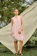 Stay effortlessly stylish in this sleeveless knee-length dress, crafted from 100% linen stripe fabric for a naturally breathable feel. Designed with a relaxed, baggy silhouette, it offers both comfort and ease. The dress features a unique collar detail and functional pockets, adding charm and practicality to the look. Perfect for warm days, it’s a timeless blend of simplicity, texture, and modern design.