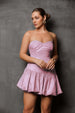 Unleash playful glamour with the Giselle mini Dress, a flirty and feminine piece featured in beautiful pale pink and black color options. This strapless mini dress commands attention with its sweetheart neckline and fitted bustline, creating a flattering hourglass shape. The voluminous, layered skirt is crafted from a luxurious jacquard fabric with subtle texture, adding movement and drama to the short silhouette. Ideal for a bachelorette party, a cocktail reception, or a celebratory night out, this dress requires minimal accessorizing: pair it with bold gold jewelry like chunky hoops and a cuff bracelet, and finish the look with elegant strappy heels to ensure this show-stopping piece remains the star of your stylish ensemble.