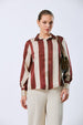 The model is wearing a long-sleeve button-down shirt with a bold vertical stripe pattern in contrasting shades. The shirt has a classic collar and cuffs, and it appears to be a lightweight, silky fabric.