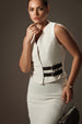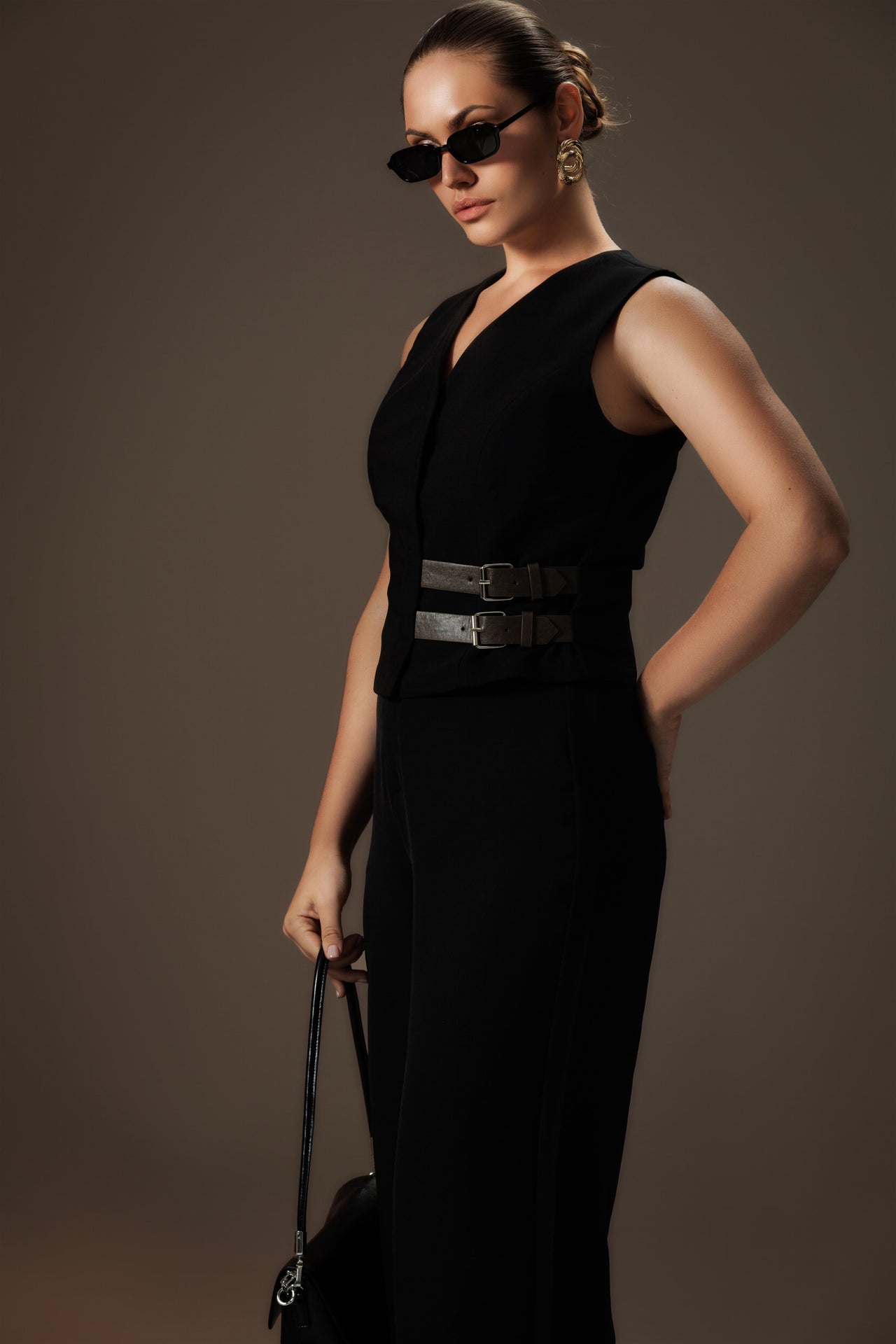 A modern, powerful alternative to the traditional blouse or blazer. This fitted black waistcoat features a crisp V-neckline and a structured, sleeveless silhouette. The waist is the focus, defined by bold, functional double leather buckle straps that cinch the form for an authoritative shape. Crafted from structured suiting fabric, this piece is ideal for layering or wearing solo. It delivers an instant injection of structure and contemporary power to any CEO ensemble.