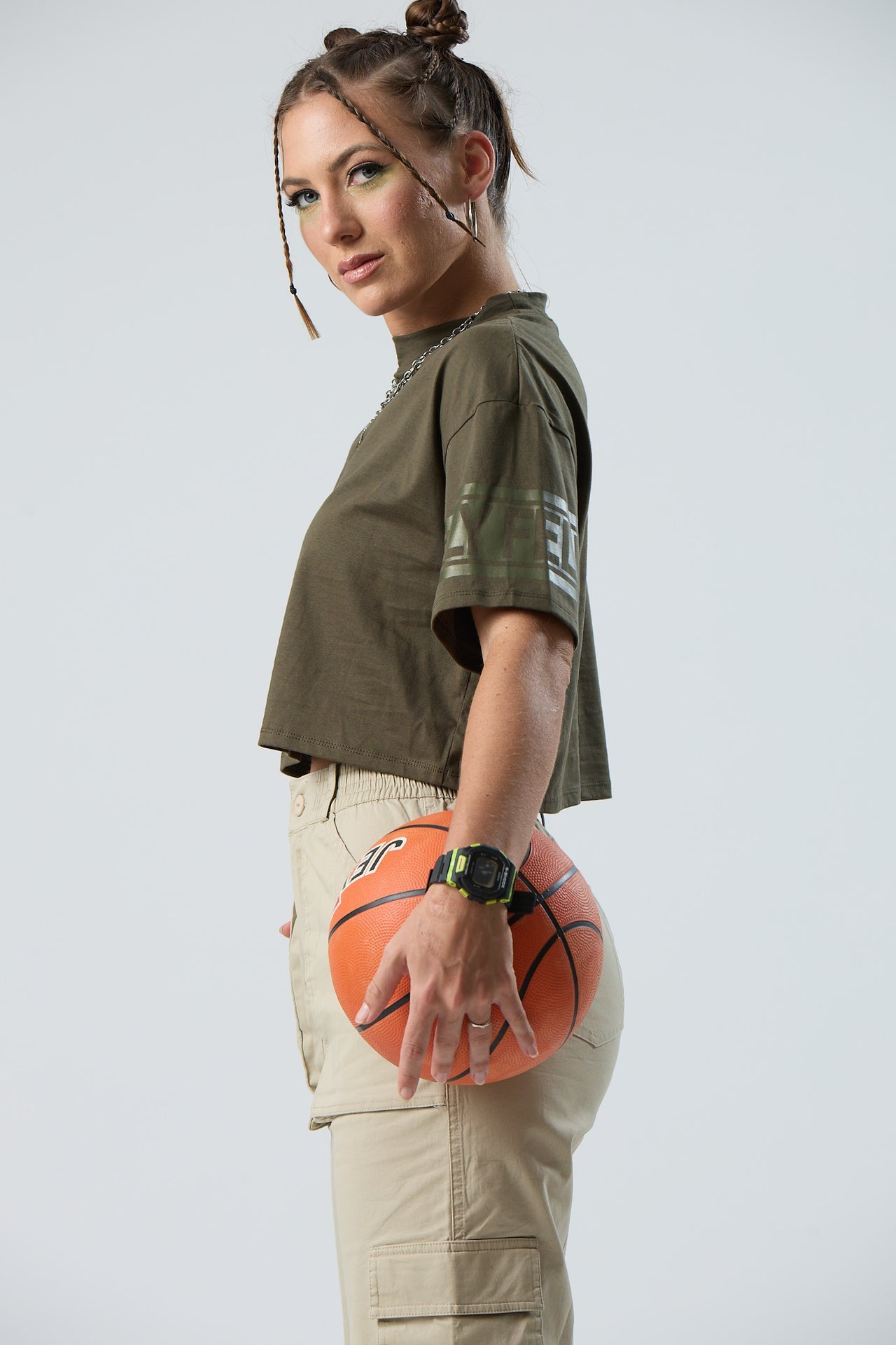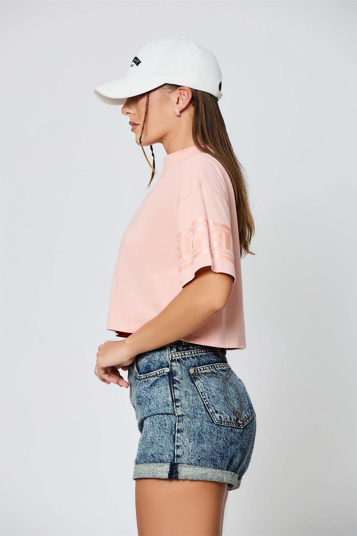 A modern cropped tee crafted from soft, breathable cotton blend for everyday comfort. The standout feature is the colour-matching ChromoShine print placed on the sleeves, creating a subtle yet futuristic shimmer that shifts hues with movement. The cropped silhouette offers a flattering, relaxed fit, perfect for layering or styling solo. Finished with clean hems and minimal stitching to let the iridescent sleeve detail take centre stage.