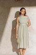 The dress is cinched at the natural waist by a wide, elasticated or gathered band, which creates a ruched effect. The skirt flows gracefully from the waist, ending at a midi length below the knee. The fabric appears to be a lightweight, textured linen or a similar natural fiber, giving it a soft and breathable feel. The model is holding a small woven straw bag, which complements the dress's natural, summery vibe.