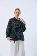 The model is wearing a long-sleeve button-down shirt. The shirt has covered in a swirling, continuous black geometric print. It has a classic collar and a relaxed, comfortable fit.