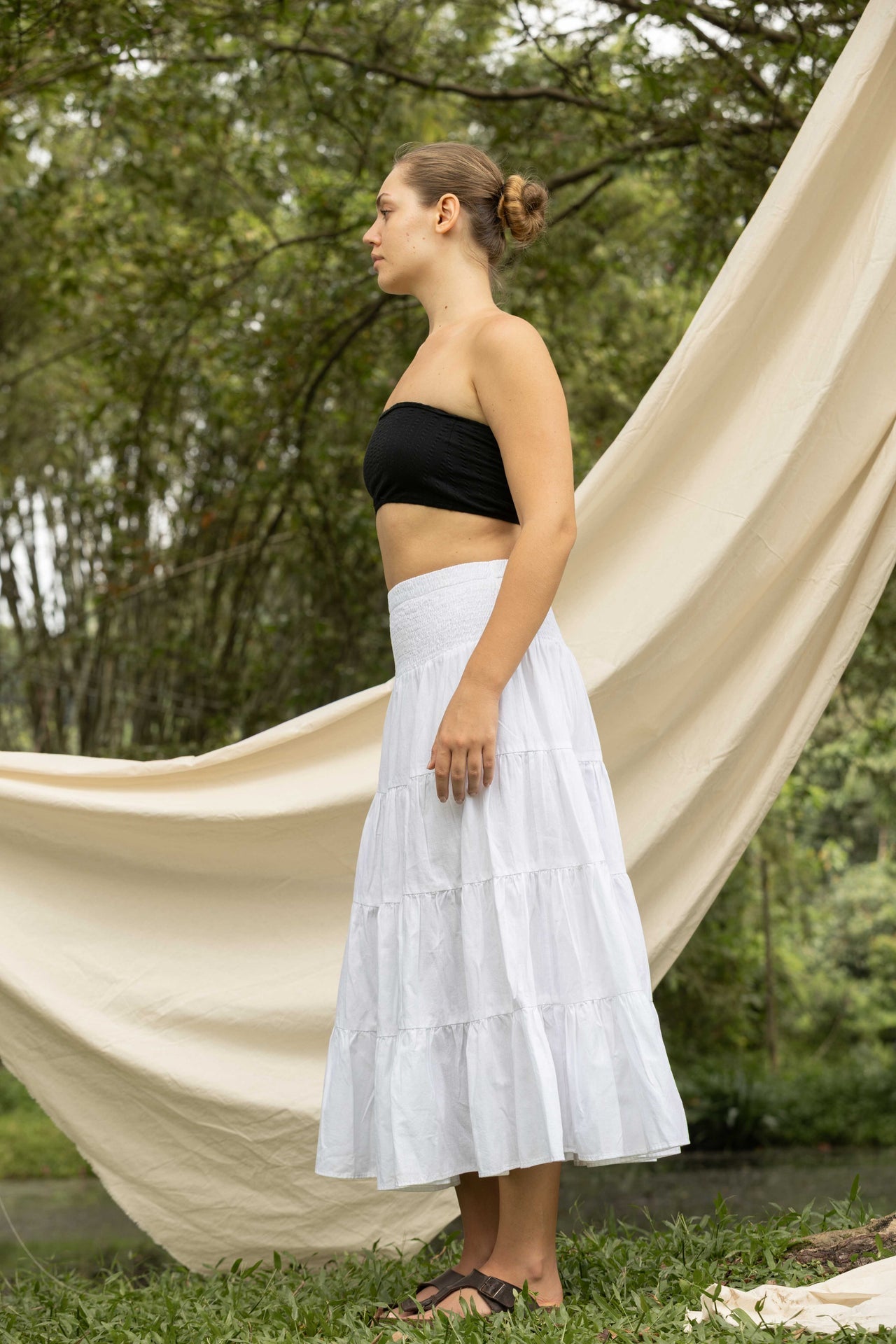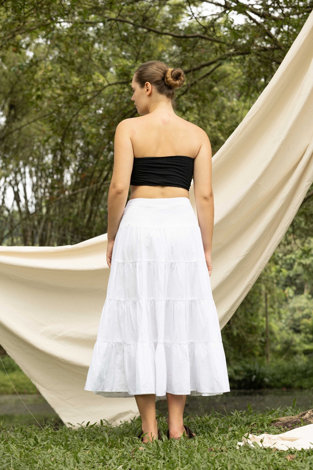 This solid linen cotton midi skirt brings effortless charm and comfort to everyday wear. Designed with a soft layered silhouette, it offers graceful movement and a relaxed fit for all-day ease. The breathable linen cotton blend enhances comfort while maintaining a refined, natural texture. Perfect for pairing with cropped tops or tucked-in shirts, this versatile skirt adds a touch of timeless elegance to your casual and semi-formal looks.