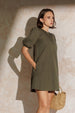This casual, short black dress has a simple, relaxed fit. It features a rounded neckline and short sleeves with a subtle puff or gather at the shoulders, adding a touch of volume. The dress has a loose, straight cut, ending above the knee. The fabric appears to be a solid, non-sheer black cotton or jersey, giving it a comfortable, everyday feel. The model is wearing white slide sandals, which contrast with the dress and complete the effortless, casual look.The most distinctive detail is the vertical pintuck that runs down the center of the front bodice, adding a touch of texture and a streamlined look to the simple design. The fabric appears to be a solid, non-sheer black cotton or a similar jersey knit, suggesting comfort and ease of wear. The dress ends above the knee, making it a versatile piece for a warm-weather day. The model is accessorizing with simple white slide sandals, completing a minimalist and effortless look.