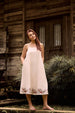 This midi-length dress, crafted from breathable linen-cotton fabric, combines comfort with feminine charm. Featuring adjustable straps and a flattering silhouette, it includes functional side pockets for everyday convenience. The standout scalloped hem with delicate floral embroidery and a unique back detail adds a subtle, handcrafted touch. Perfect for warm days or casual outings, this dress offers effortless style with a hint of romantic elegance.