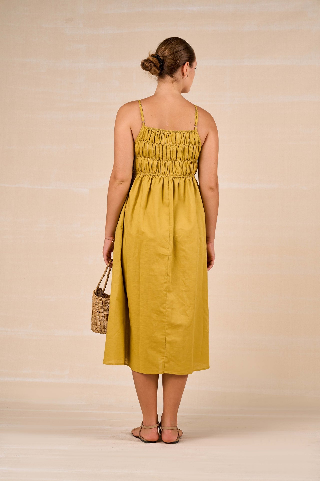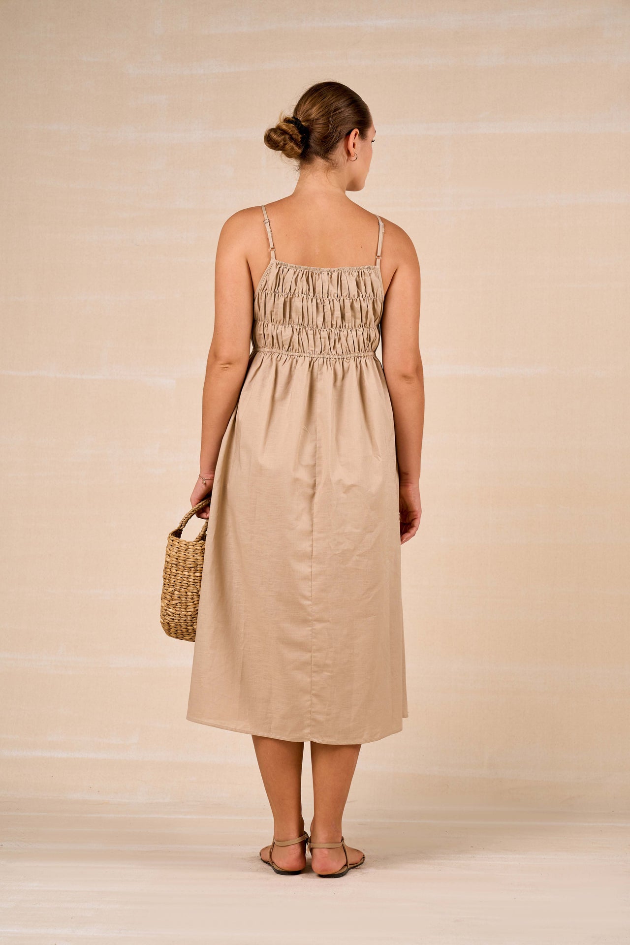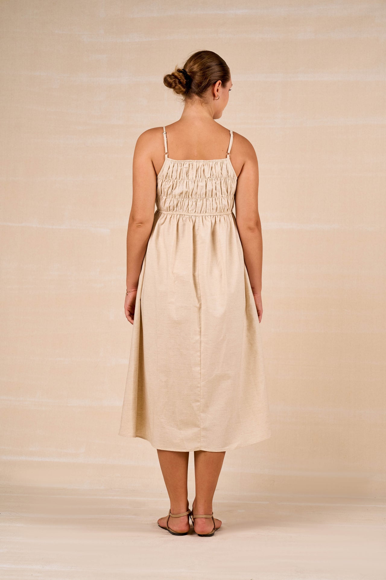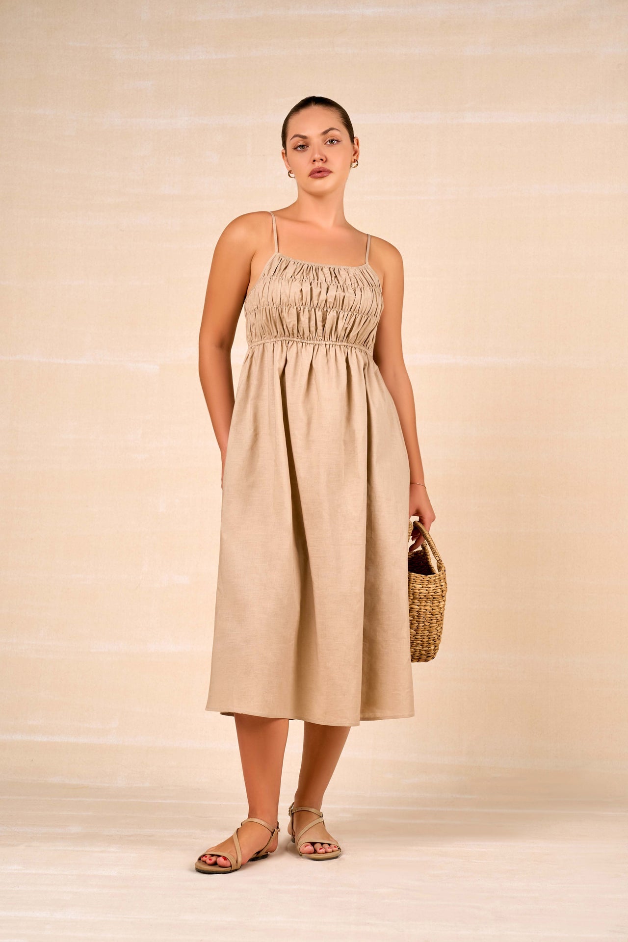 This solid maxi dress is crafted from breathable linen-cotton fabric for effortless comfort and ease. Designed with an elegant boat neckline in the front and a striking deep V-neck at the back, it balances sophistication with subtle allure. The flowing silhouette enhances movement, while functional side pockets add everyday practicality. Lightweight and airy, this dress is perfect for warm days and relaxed occasions.
