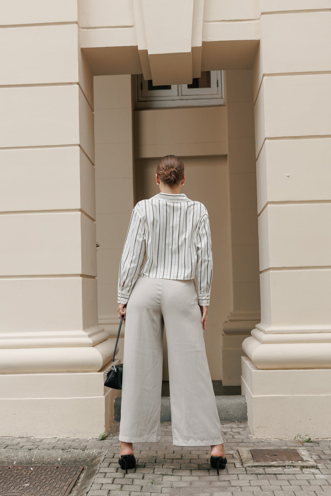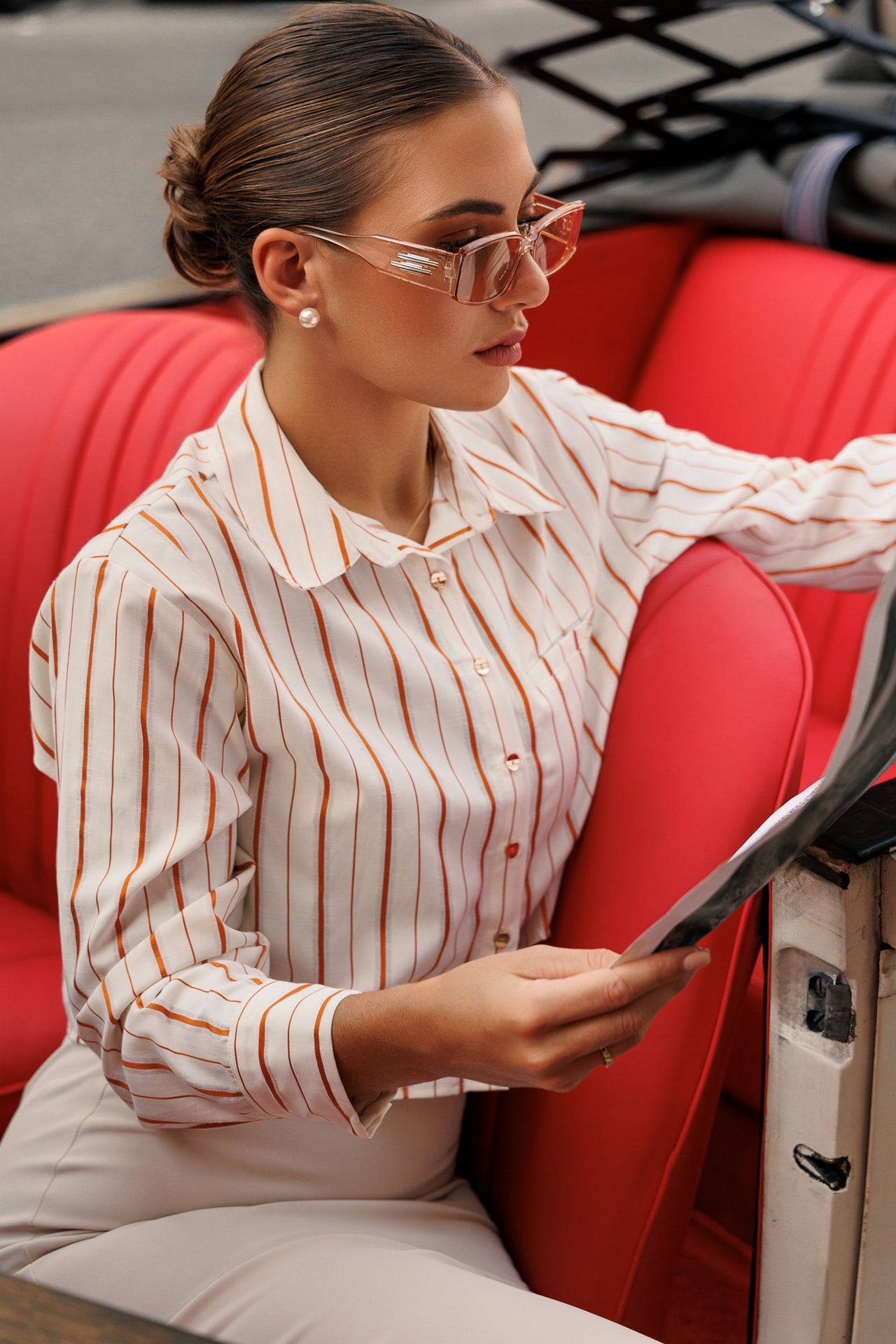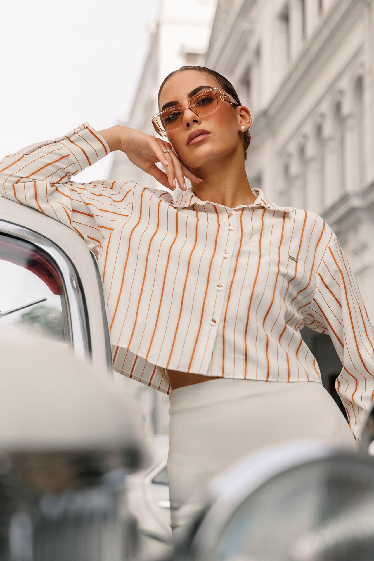 This image showcases a sophisticated and modern take on a classic look. The woman is wearing a cropped, long-sleeved button-down shirt with a cream base and thin vertical stripes . She pairs it with a high-waisted, solid cream skirt, creating a cohesive and flattering silhouette. The look is accessorized with chic sunglasses featuring thick, translucent frames and a delicate pair of earrings, embodying a sense of effortless, "old money" elegance with a contemporary twist.