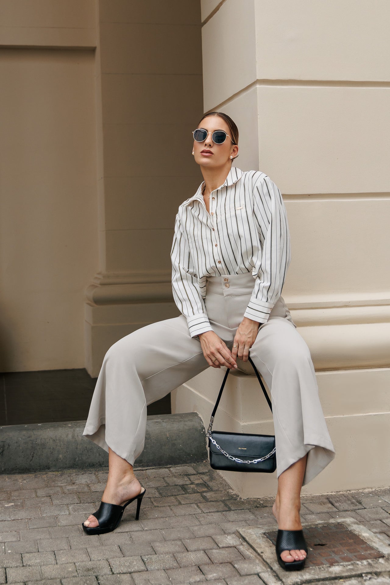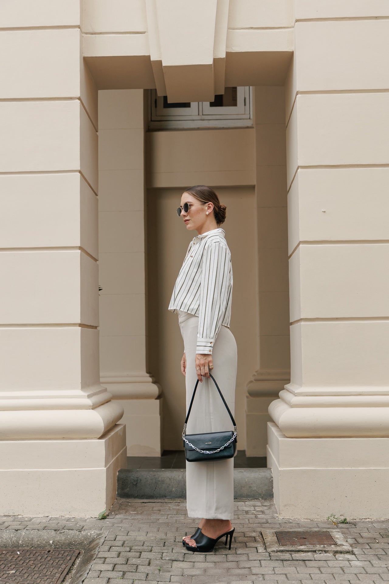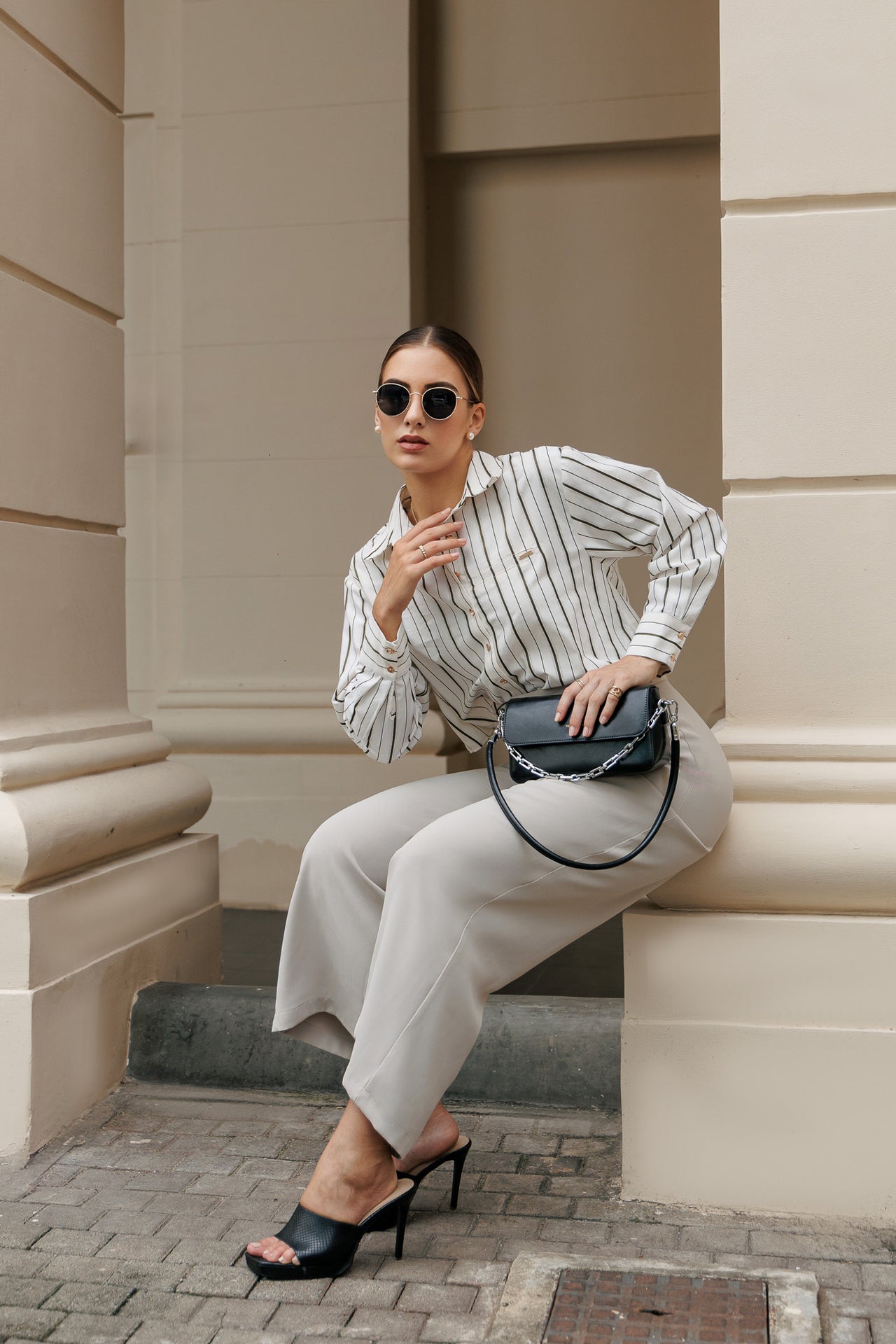 This image showcases a sophisticated and modern take on a classic look. The woman is wearing a cropped, long-sleeved button-down shirt with a cream base and thin vertical stripes . She pairs it with a high-waisted, solid cream skirt, creating a cohesive and flattering silhouette. The look is accessorized with chic sunglasses featuring thick, translucent frames and a delicate pair of earrings, embodying a sense of effortless, "old money" elegance with a contemporary twist.