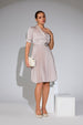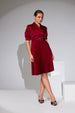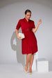 Command attention in this rich satin dress, a timeless blend of vintage elegance and modern tailoring. The wrap-style bodice features a structured collar and softly puffed half sleeves, balanced by a pleated A-line skirt that moves with graceful ease. A matching belt with a bold buckle cinches the waist for a defined silhouette, offering both structure and sophistication. For a better styling option you can pair it with metallic heels and a sleek clutch or layer with a cropped blazer or structured coat for an elevated evening look.