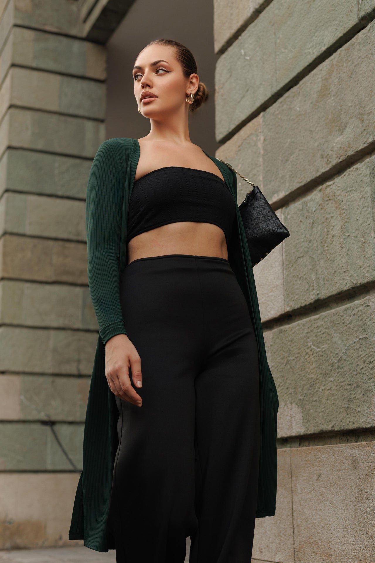 This longline cardigan, made from a structured knitted fabric, offers a sleek and refined look with a touch of modern sophistication. The heavier knit provides a smooth drape and structured silhouette, enhancing its polished appeal. Featuring an open-front design and full-length sleeves, it’s ideal for layering over tailored or casual pieces, making it a versatile addition to a contemporary wardrobe
