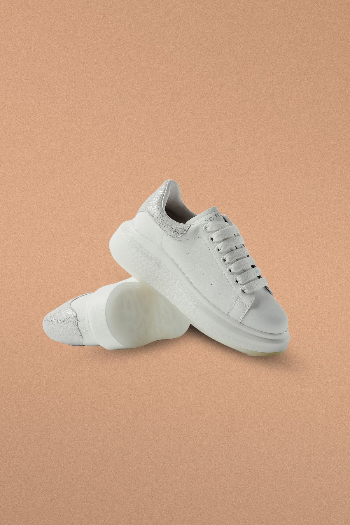 Sporty meets sophisticated in Quarterdeck Platform. Designed in synthetic leather with mesh panels for breathability, it features pigskin insoles, a supportive polyurethane sole, and a silver-grey finish that catches the light with every step.