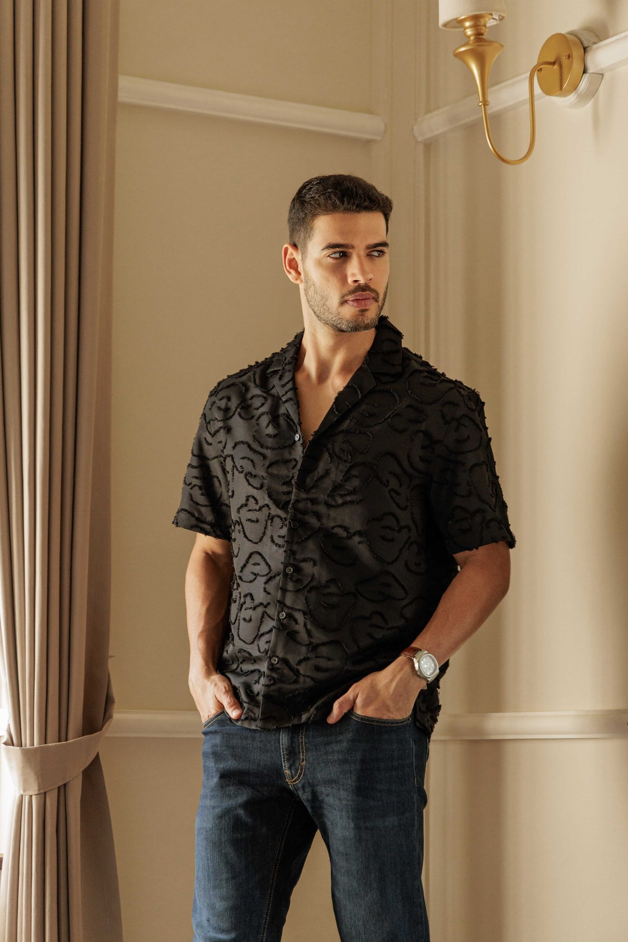 A statement of understated sophistication, this short-sleeve shirt is defined by its intricate textured fabric that blends comfort with a refined visual appeal. The tactile surface adds depth and dimension, offering a subtle pattern that elevates its minimalist design. Tailored with a clean collar, button-down front, and relaxed fit, it’s crafted for effortless versatility — perfect for occasions that call for laid-back polish and modern confidence.