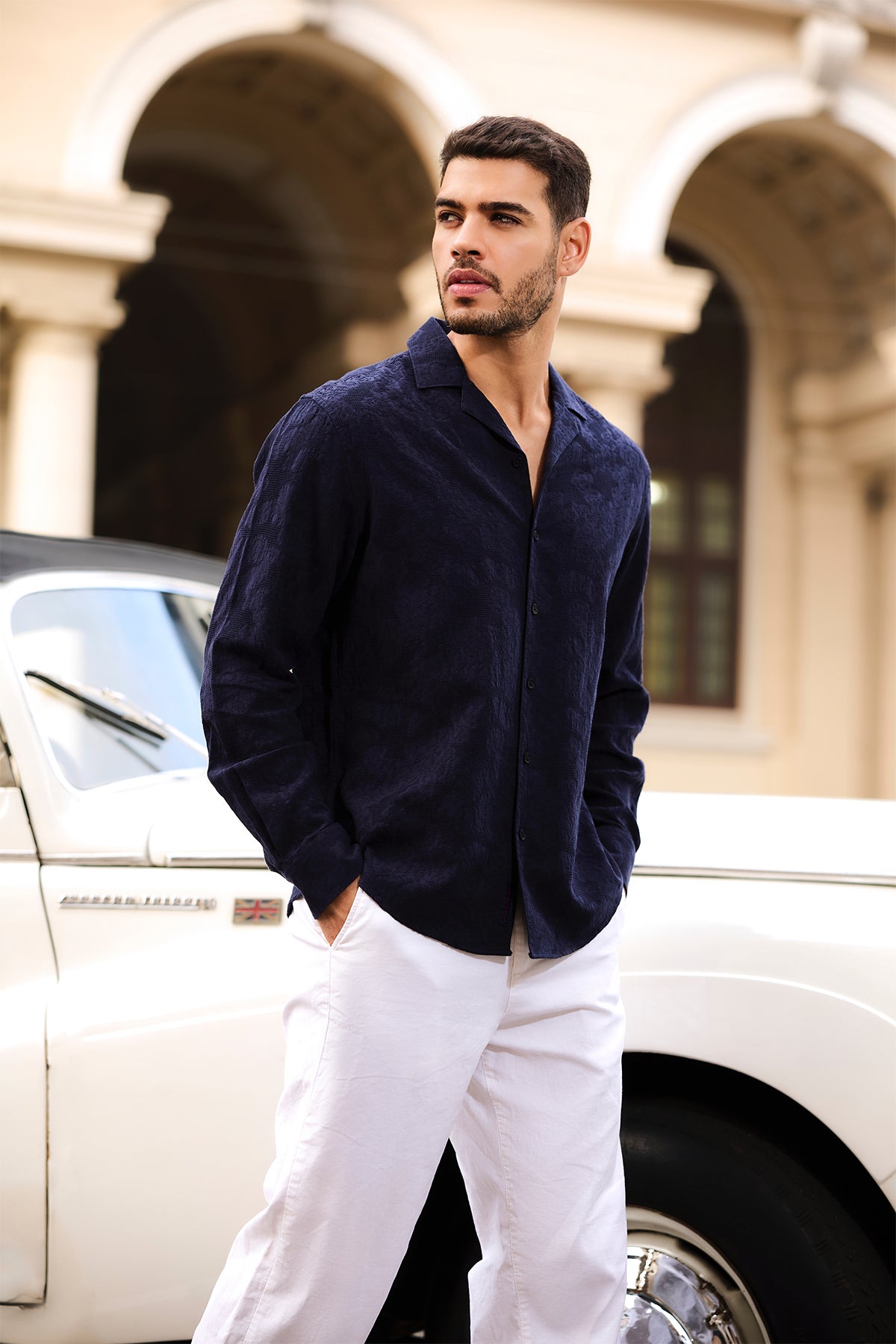 Refined and distinctive, the Bloom Textured Shirt elevates classic menswear with a subtle floral weave against a deep navy backdrop. The lightweight fabric offers both comfort and sophistication, while the open collar and button-down design add a modern relaxed edge. Perfect for evening outings or elevated casual wear, this shirt pairs effortlessly with both light and dark trousers. A confident piece that balances understated detail with timeless elegance.