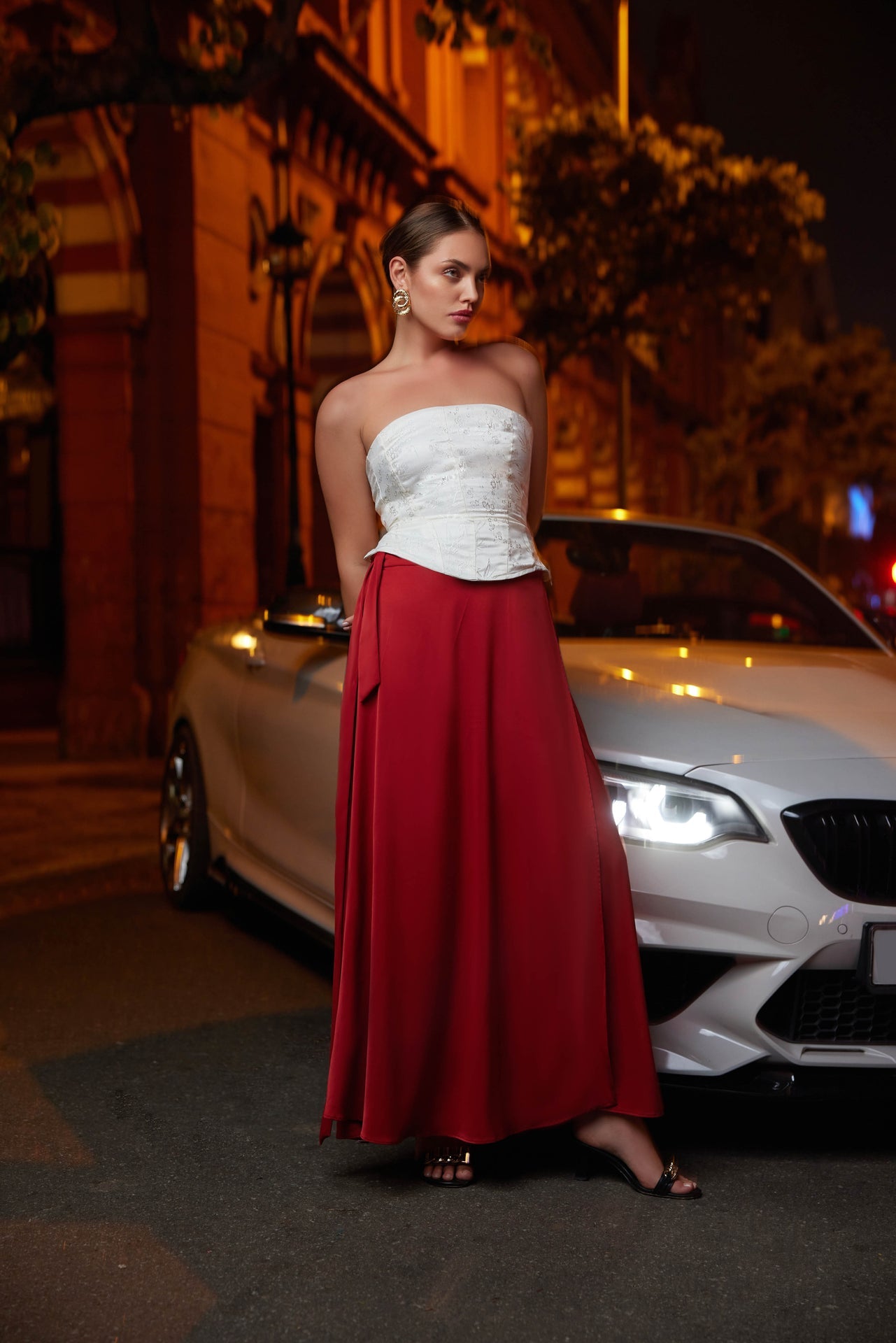 Embrace a structured, romantic silhouette with the Regency Rêverie Corset, a stunning strapless top designed to be the centerpiece of your evening ensemble. This exquisite corset is crafted from a rich, textured fabric in a crisp white and red tones, featuring intricate vertical stitching or subtle patterning across the bodice that offers a luxurious, form-flattering structure. The strapless look,back criss-cross detailing and the unique shape of waistline, creating an alluring and vintage-inspired yet modern look. This piece is perfectly suited for glamorous events like a gala dinner, a holiday cocktail party, a formal date night, or even an elevated resort evening. For styling, pair it with a flared maxi Skirt for a vibrant, high-impact pairing, or layer it over high-waisted tailored trousers for a sleek, monochromatic outfit. Accessorize with a delicate chain necklace and an elegant updo to truly showcase the neckline and the back-detailing of the style.