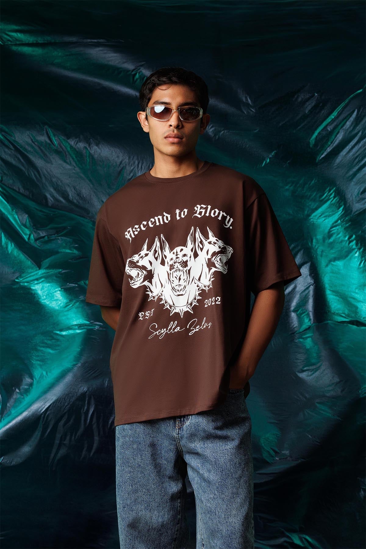 This oversized Scylla Zelus tee features a bold front graphic of a three-headed hound — a symbol of unshakable power and fearless ambition. Designed for those who rise through chaos, the "Ascend to Glory" statement says it all. Crafted from breathable cotton jersey with a relaxed drop-shoulder silhouette, it's made to move with you through the streets or the grind.