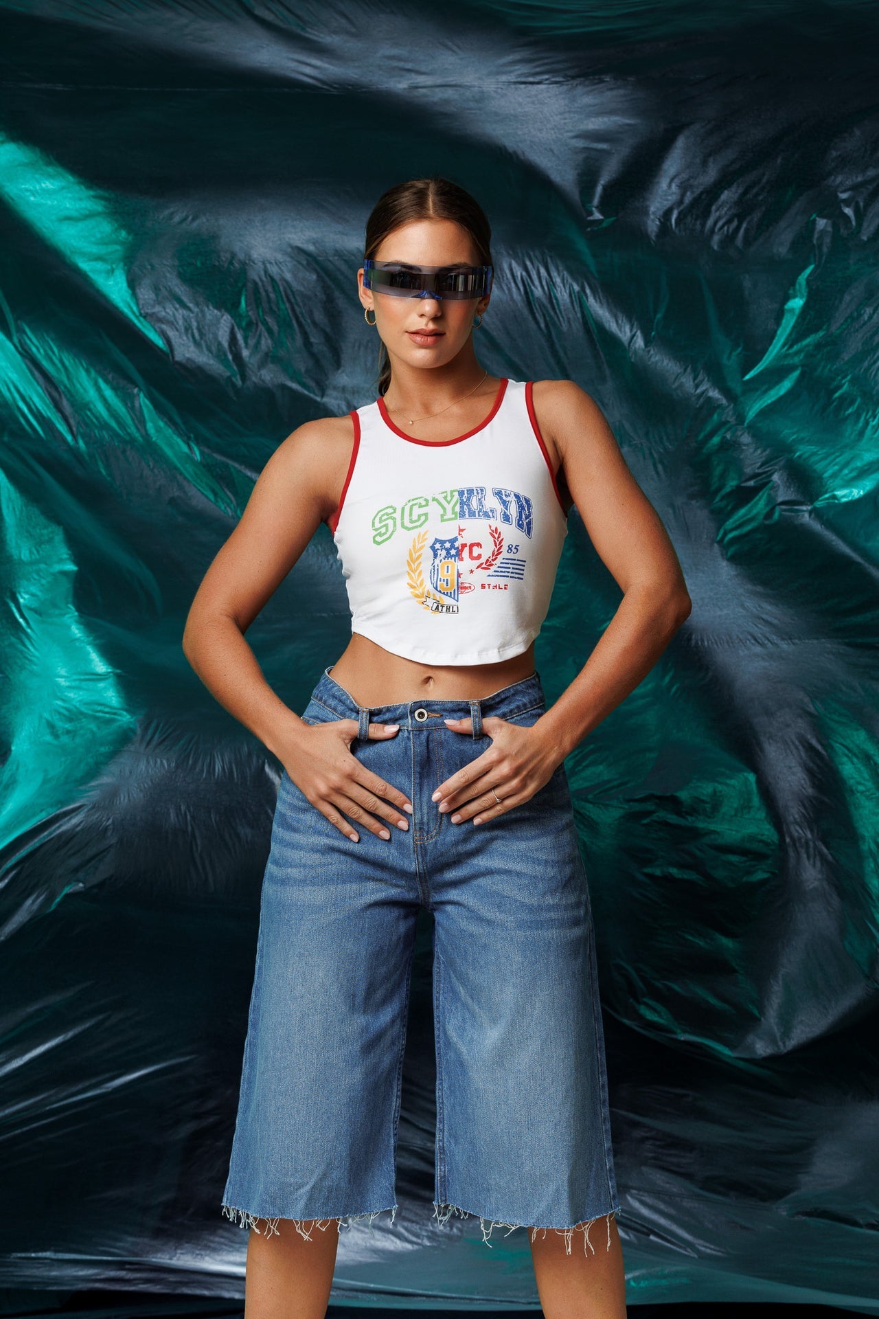 Tap into your team spirit with the Scylla League Crop — a cropped racerback top that throws it back to '80s athletic clubs with a future-ready edge. Designed in a body-hugging soft cotton fabric, it features contrast binding, a bold multi-color collegiate crest graphic, and a clean curved hem. It’s everything retro-sport dreams are made of — fearless, fun, and unapologetically Scylla.
