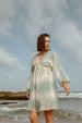 This stylish short dress is perfect for a breezy day by the sea. It features a relaxed, free-flowing silhouette and a vibrant ombre-style print that blends sunny yellow with soft white. The dress has a flattering V-neckline with a tie detail at the bust, and its long, billowy sleeves with elasticized cuffs add a touch of bohemian charm. Made from a lightweight fabric, it is designed for comfort and ease of movement, making it a go-to piece for any casual, warm-weather occasion
