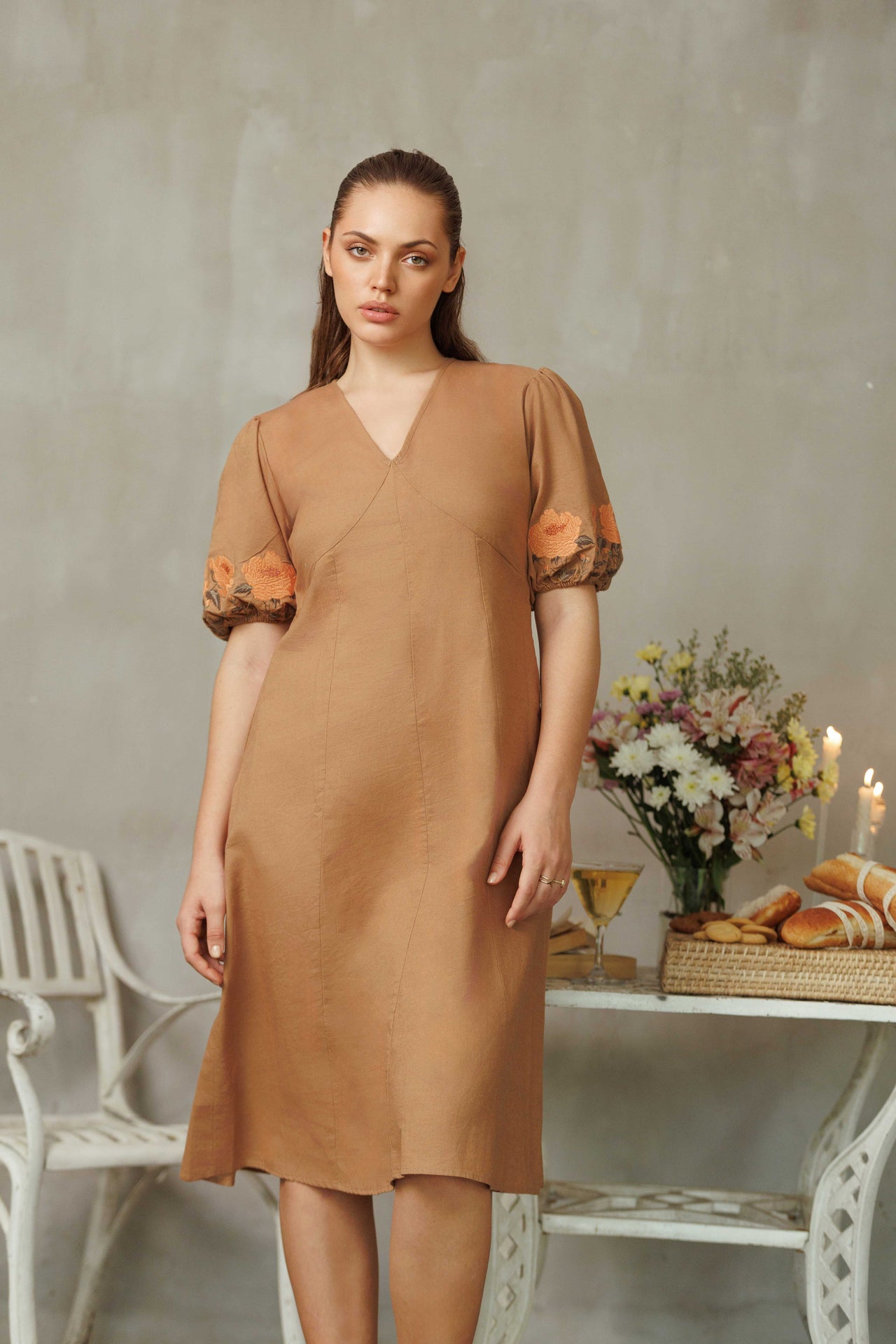 This midi-length dress is crafted from breathable, comfortable linen-cotton fabric, making it perfect for warm days. Featuring charming puff sleeves adorned with delicate floral embroidery, it brings a touch of artisanal elegance to a timeless silhouette. Subtle style lines add flattering structure, while functional side pockets provide everyday convenience. Effortlessly versatile, this dress blends natural comfort with refined detailing, making it an ideal choice for casual outings, garden parties, or relaxed gatherings.