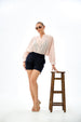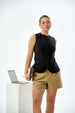 Providing a striking, sharp contrast are high-waisted, tailored shorts in a deep colous. They are cut in a mid-thigh length and feature the hallmarks of formal trousers, including a wide waistband with classic belt loops and deep, functional side pockets. The fit is slightly relaxed through the leg, creating a clean, structured A-line shape. The fabric is a smooth, crisp weave that helps the shorts maintain their sophisticated, tailored silhouette.