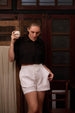 a contemporary core basic designed to sculpt and flatter, cut from a comfortable, stretchable vertical ribbed knit fabric in a sophisticated color range. This piece is defined by its subtle asymmetrical neckline, featuring one slightly wider shoulder strap for a modern, fashion-forward detail. The fit is body-skimming and cropped, ending neatly at the waistline, making it the perfect piece to pair with high-waisted bottoms, such as the black mini-skort shown, to create a long, lean silhouette.