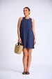 This is a short, casual dress featuring a simple and relaxed A-line silhouette that flares out gently from the bust, providing a comfortable and loose fit. It has a high, rounded neckline and a sleeveless design with a racerback-style cut at the shoulders, highlighting the arms and upper back. There are visible seam lines running vertically down the front of the dress, which add a subtle structural detail without disrupting the overall minimalist aesthetic. The fabric appears to be a lightweight, matte material, suitable for warm weather. The hemline is short and falls well above the knee. The overall look is clean, simple, and versatile, making it an easy-to-wear piece for everyday outings.
