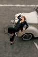 This is a sharp, double-breasted blazer in a muted, earthy toned like taupe or olive-gray and black . It is expertly tailored to create a structured silhouette, with a classic notched lapel and two rows of buttons that blend seamlessly into the fabric. The blazer's clean lines and professional design give it a polished, sophisticated feel, perfect for a powerful and elegant "old money" office look.