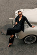 The pants are high-waisted trousers with a dramatic wide-leg silhouette. They are made from the same rich, solid-colored fabric as the blazer, creating a cohesive and minimalist suit. The cut is full and flowing from the hip down, adding an effortless sense of elegance and movement. This timeless design is both comfortable and incredibly chic.