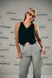 This front button-open tank is made from sturdy twill fabric, offering a clean and structured look. The design features a pointed hemline at the bottom, adding a sharp and modern touch to the silhouette. Metal buttons down the front bring a utilitarian edge, while the sleeveless cut keeps it cool and versatile. A standout piece that pairs easily with both casual and elevated styles.