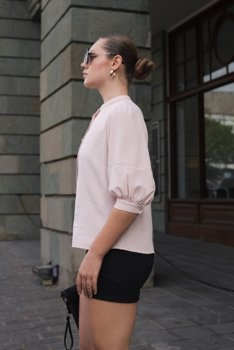 The most distinctive elements are the sleeves, which are 3/4 length and have a slight billow or puff effect, cinched at the elbow with gentle gathering. The overall fit is loose and breezy, creating a feminine and elegant look that contrasts nicely with the black mini-skirt.