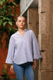 Embrace effortless style and comfort with this oversized light blue shirt, a modern take on a timeless wardrobe staple. Designed for a comfortable, relaxed fit, this piece perfectly balances classic tailoring with a fashion-forward silhouette.The shirt features a soft, appealing light blue base subtly detailed with fine white pinstripes. This delicate stripe pattern adds a refined visual texture while maintaining a clean, minimalist aesthetic. It's likely crafted from a crisp yet soft cotton or cotton-blend fabric, ensuring it's breathable for all-day wear and has the perfect amount of structure to maintain its beautiful drape.