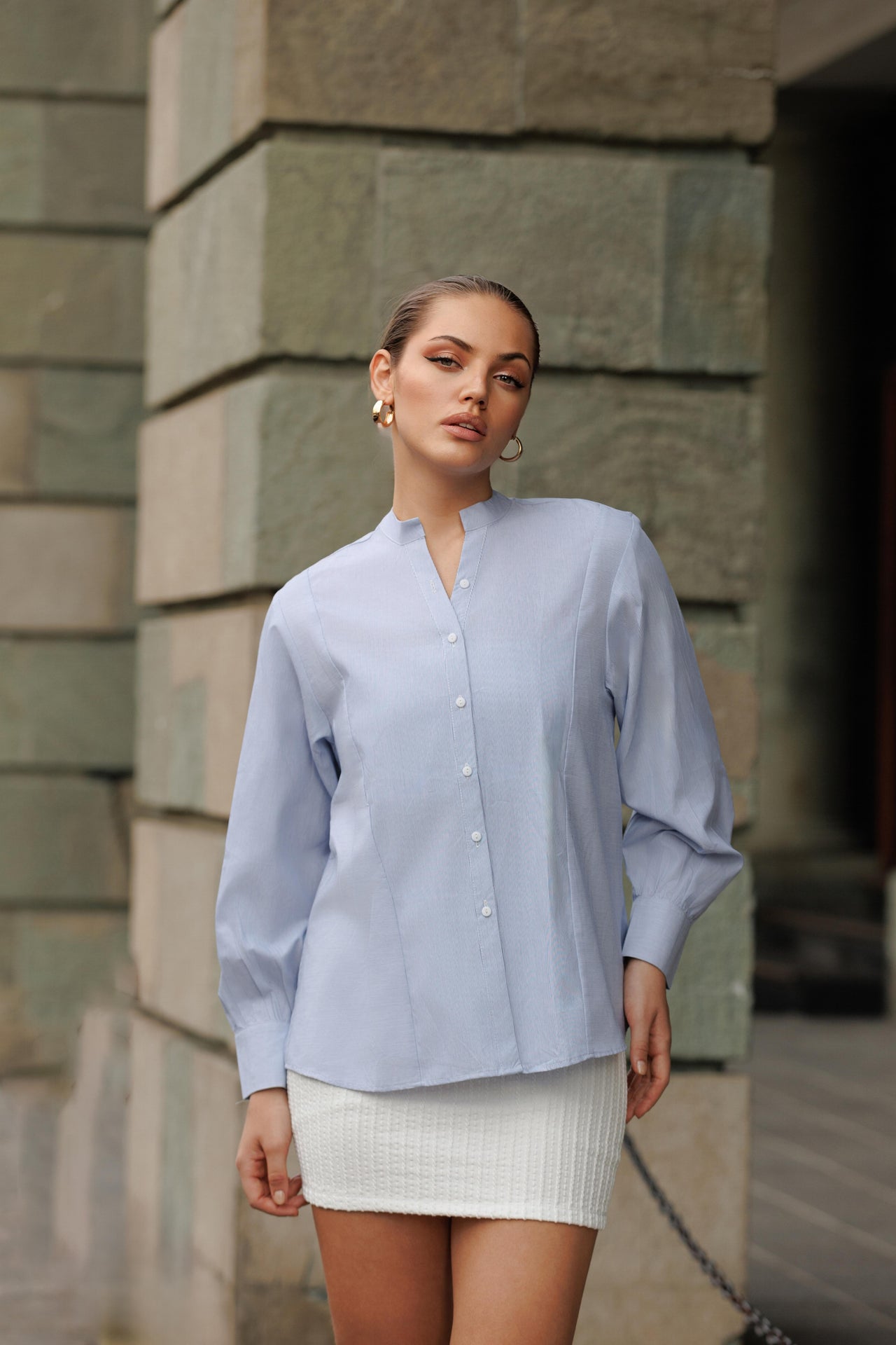 This elegant top blends classic refinement with a modern touch. It features a narrow V-split neckline that flows into a button-down front, offering a clean and structured look. The full sleeves are gathered at the cuffs for soft volume, balancing professionalism with ease. Crafted from a lightweight, breathable fabric, it drapes gracefully while maintaining a refined silhouette, ideal for polished office wear or effortless everyday sophistication.