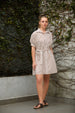 The top is rendered in a soft, airy powder blue. The fabric is lightweight and sheer, possibly a cotton voile or organza, giving it a delicate structure and ethereal feel.The fit is slightly cropped and billowy through the body, designed to be worn either loose or neatly tucked into a high-waisted bottom, as demonstrated in the styling.