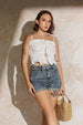 The top features a spaghetti strap neckline that is gathered and ruffled, creating a playful, feminine touch. The bodice is cinched with an elasticated gathering, giving the top a comfortable fit. The most prominent feature is the multiple ties that run down the center front. These ties can be adjusted, allowing the wearer to create a customizable peek-a-boo effect. The hemline of the top is also ruffled, mirroring the neckline. wearing the top with high-waisted white pants, a classic and versatile pairing for this style. This combination makes for an ideal casual outfit for warm weather, blending a relaxed fit with chic, fashionable details.